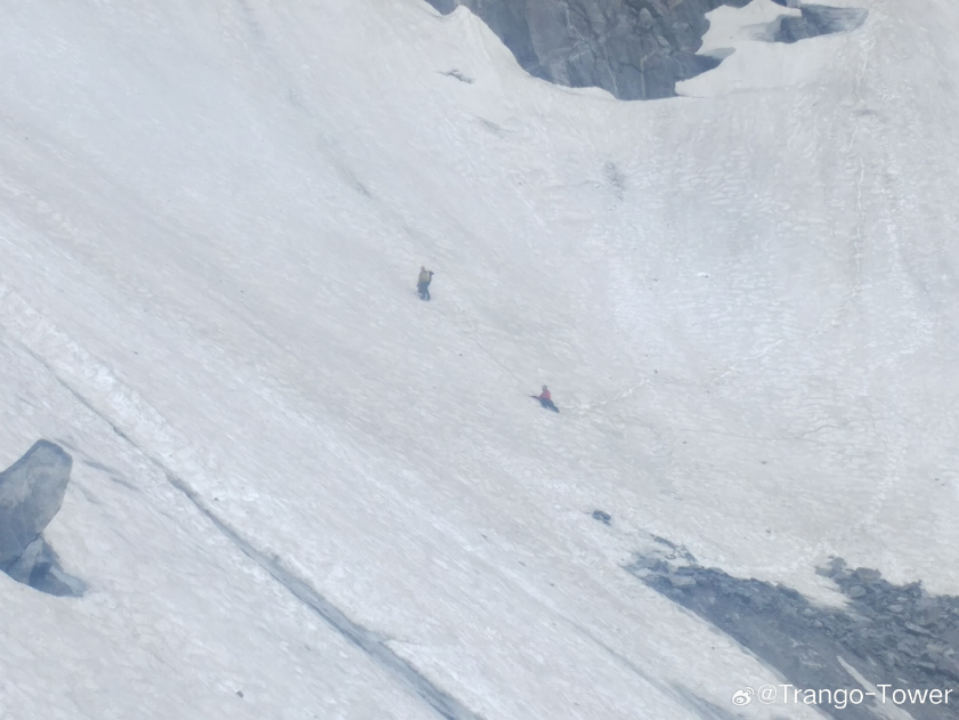 那次我受伤,要回去是很不容易的,下到岩壁底还有一个很大的冰川,要从冰川上过去。下降的时候,身体本来要靠两条腿支撑岩壁,但当时我只有一条腿了,身体不稳,晃来晃去,受伤的腿也甩来甩去,剧疼无比。在冰川上,也只能躺着,拿手拉着绳索向上爬,很要命。