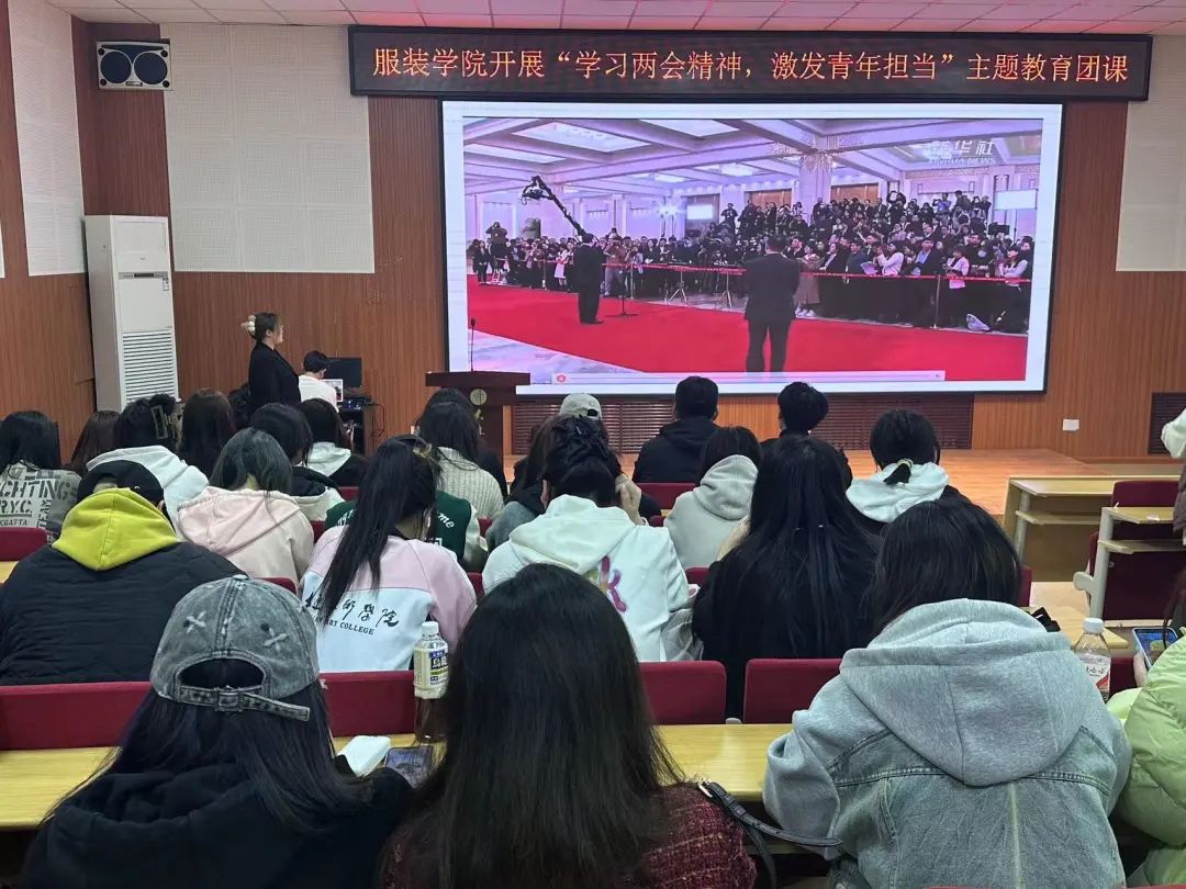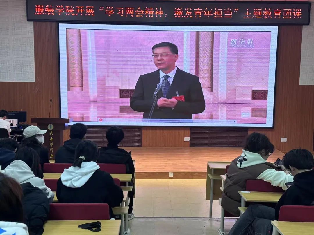 学习两会精神不仅可以帮助同学们了解国家的发展方向和政策,加强团组织的凝聚力和战斗力,培养同学们的创新精神、全球视野和社会责任感,同时也可以提高同学们的政治素养和参与社会事务的能力,更好的发挥自己的才能和潜力,为实现国家的发展目标做出贡献。为此,服装学院于2024年3月14日在F501开展以“学习两会精神,激发青年担当”为主题的团学活动。本次团课由服装学院组织部副部长李佳益主持。