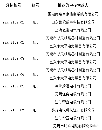 国网江苏省电力有限公司无锡供电分公司2024年第二次产业物资授权公开招标批次采购-2评标工作已经结束,现将评标委员会推荐的中标候选人予以公示,公示期3日。投标人或者其他利害关系人若对评标结果有异议的,请在中标候选人公示期间以书面形式提出。