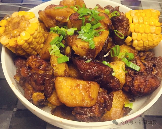 玉米土豆炖小排、荷塘小炒、葱油卷、红枣双米粥