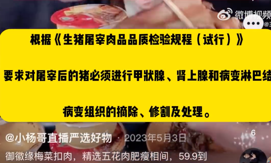 3月16日,知名打假人士王海通过网络平台曝光了一则关于直播电商食品安全的重大隐患——知名主播“疯狂小杨哥”和电商平台东方甄选的直播间销售的一款名为“御徽缘”梅菜扣肉产品被查出含有违规使用的槽头肉,其内含未经妥善处理的淋巴肉和甲状腺组织,对人体健康构成潜在威胁。按照国家相关规定,槽头肉因其包含较多淋巴结组织,并非食品加工原料,严禁用于食品生产。