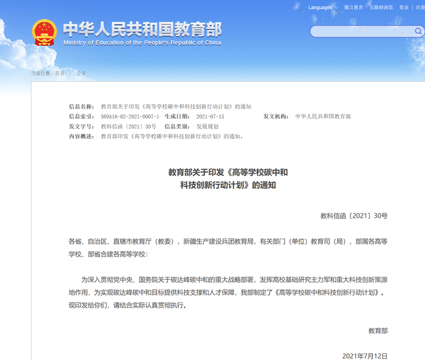 目标有了,方案也有了,下一步就是人才了,教育部于2021 年 7 月底发布《高等学校碳中和科技创新行动计划》其中提到:利用 3~5 年时间,在高校系统布局建设一批碳中和领域科技创新平台,汇聚一批高水平创新团队;通过 5~10 年的持续支持和建设,若干高校率先建成世界一流碳中和相关学科和专业。