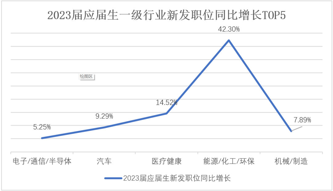 随着我国绿色转型持续深入。绿色生产生活方式加快形成,绿色转型与经济增长协同发展成效不断显现。数据显示能源/化工/环保应届生职位同比增长42.3%,同比增幅遥遥领先第二名的医疗健康行业,从前不被看好的领域有了抬头迹象。