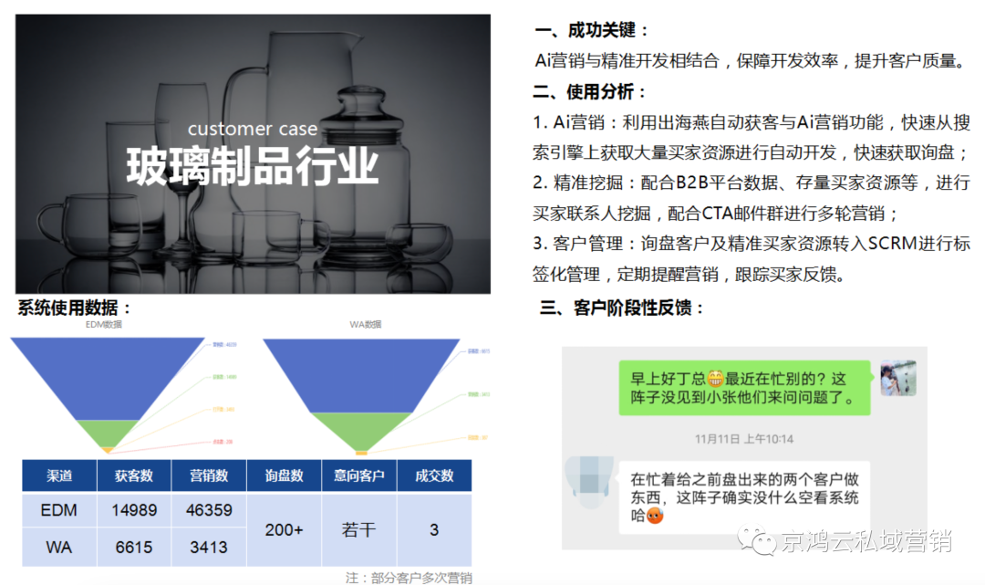 玻璃制品行业外贸获客案例,EDM获客14989个,WhatsApp获客6615个,询盘数200+,成交数3个。AI营销与自动开发、B2B平台数据、存量买家资源等精准开发相结合,保障开发效率,提高客户质量。