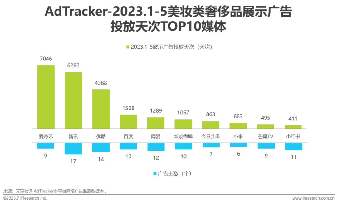 从品牌投放天次看,爱奇艺、腾讯、优酷三个平台为美妆类奢侈品广告主的主要投放媒体