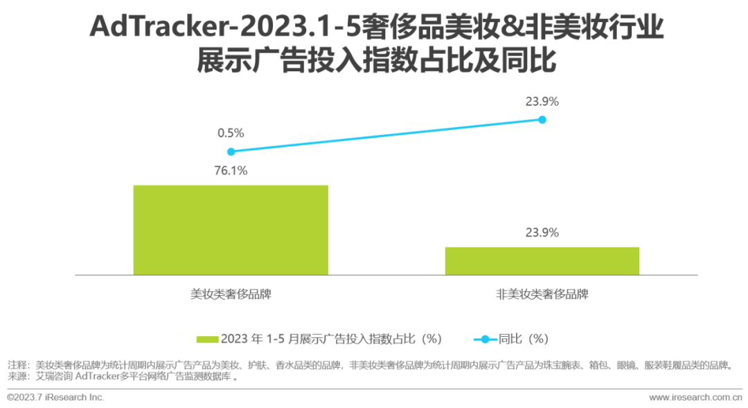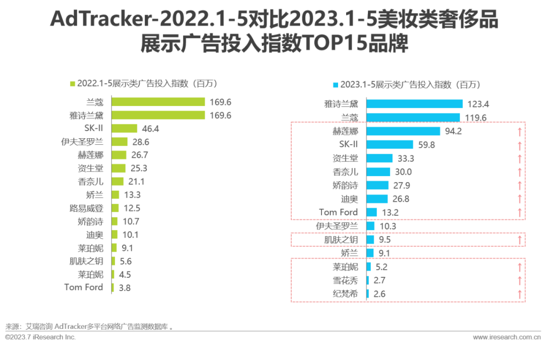 2023 年 1-5 月,奢侈品行业展示类广告投放恢复增长,投入指数达8.10 亿,同比+10.1%,恢复至 2021 年的 82.4%,达2019 年同期的97.6%。其中,增长主要由非美妆类奢侈品牌提升投放带动。