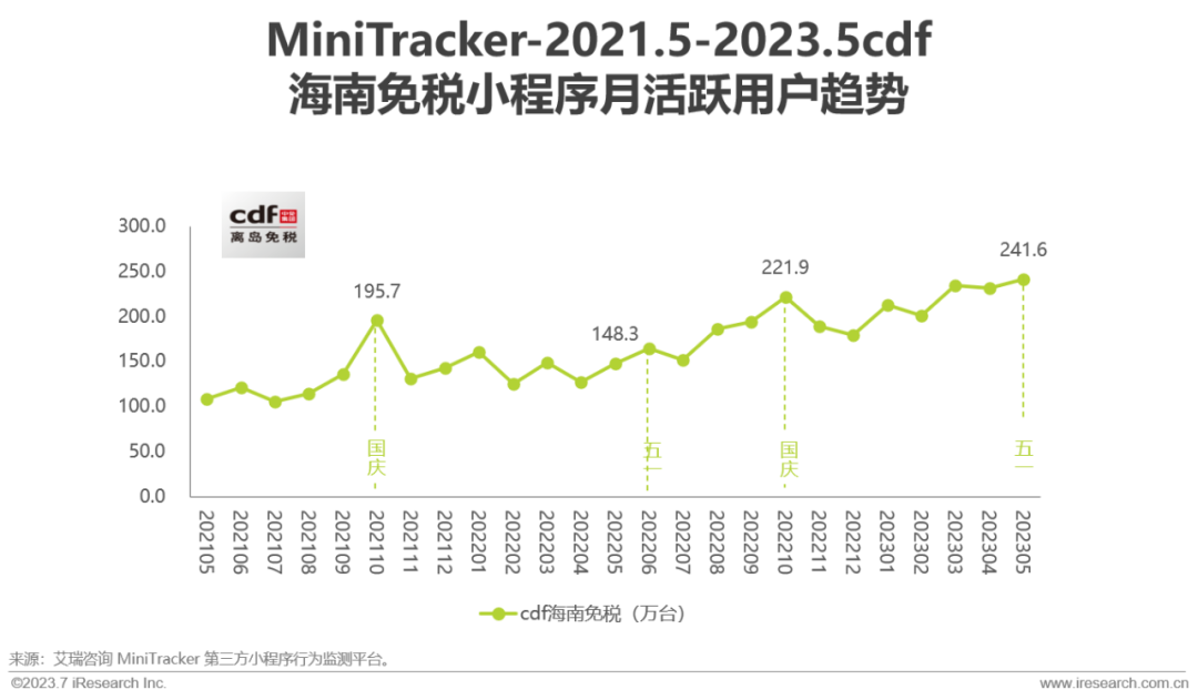 近年来,海南离岛免税业务快速发展,cdf海南免税小程序作为中免集团线上官方会员购物平台,提供“网上购物,机场、轮渡、火车站提货”服务,小程序用户规模持续上涨,今年2月份起,随国内旅游消费反弹式复苏,用户规模至五一黄金周当月达241.6万台,同比增长62.3%,超越上一年国庆假期峰值。