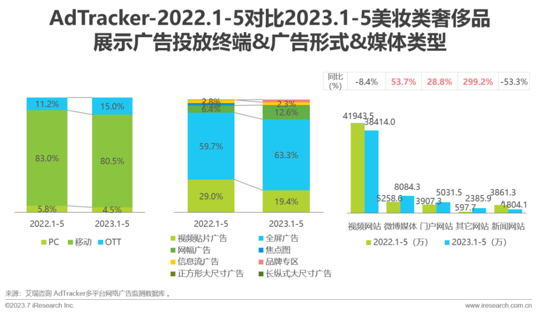 从展示类广告的媒体选择来看,美妆类奢侈品的广告主更倾向于投放视频网站,此外,门户网站、微博媒体也是众多广告主偏好的媒体类型;移动端为美妆类奢侈品展示广告的主要投放终端,占比高达80.5%;全屏广告是最主要的广告形式,与2022年相比,2023年占比提升3.6%,其次是视频贴片广告。