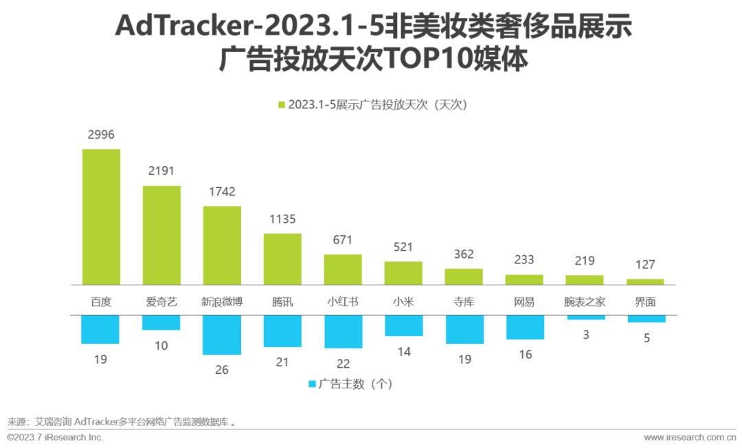投放天次上,百度、爱奇艺、新浪微博分别为非美妆类奢侈品广告主布局搜索、视频、社交三大场景的TOP1媒体平台