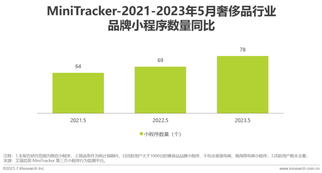 品牌小程序在奢侈品牌激发消费者兴趣、影响复购的环节中扮演日益重要的角色,2023年,奢侈品行业小程序建设迎来突破,行业月活跃用户和小程序数量双提升,其中,奢侈品小程序覆盖人群规模大幅提高至4065.1万台,同比增长54.1%;小程序数量从69个增加至78个,净增9个。
