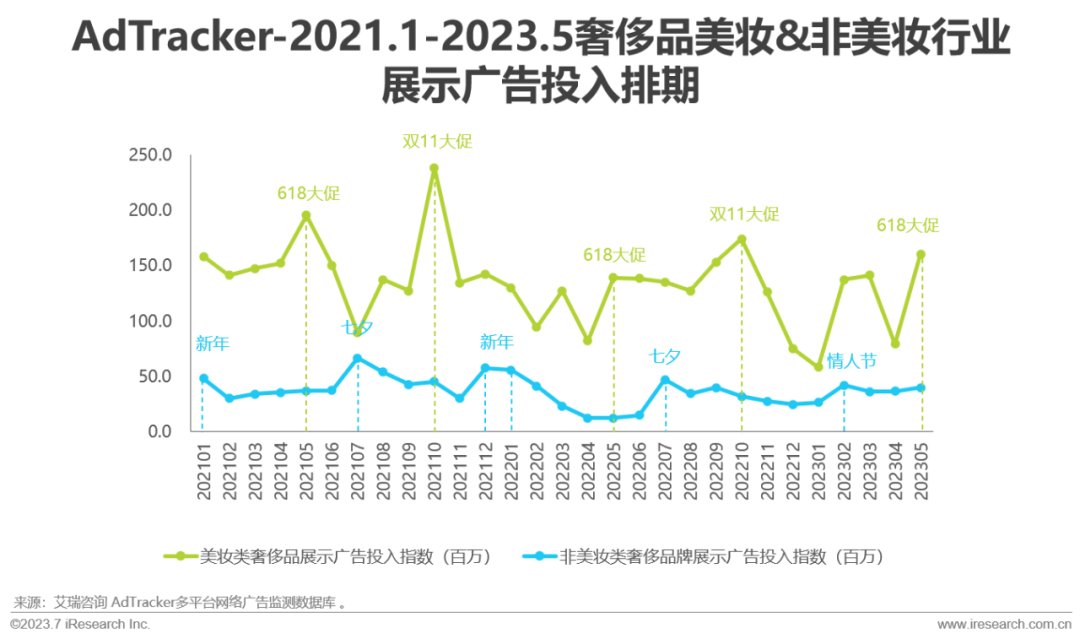 美妆类奢侈品展示广告投放侧重电商大促,非美妆类则倾向节日节点投放