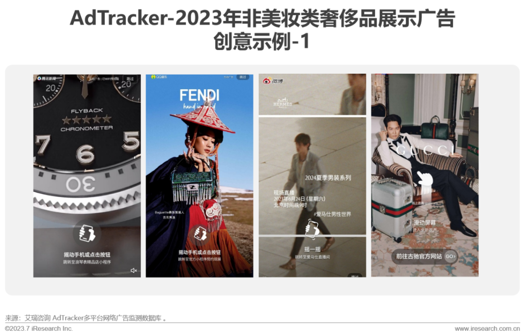 表现一:点击-跳转类广告创意占主流。以往,奢侈品牌展示广告仍以品牌形象树立为主,品牌广告大片、产品露出、明星代言等广告创意占据主要投放比重。2023年,广告主风格转变,点击跳转至小程序、官网、直播间等导流类的广告创意成为行业主流趋势。