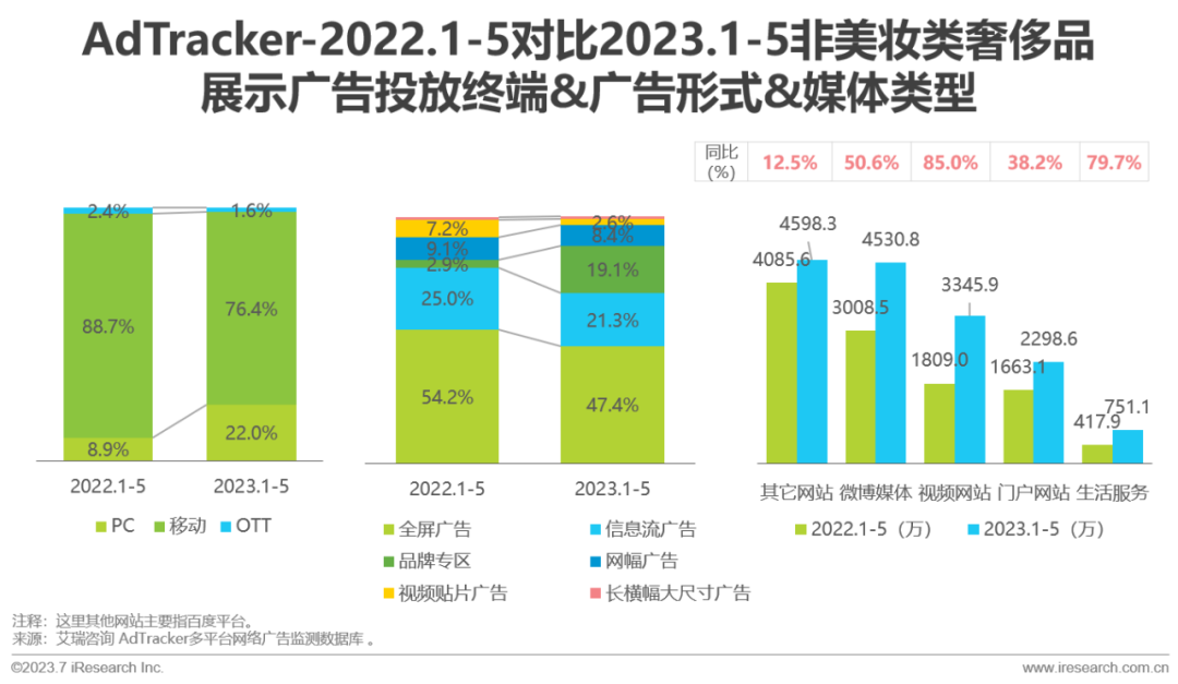 非美妆广告主对PC端的投放有所增加,但移动端仍占总体76.4%的份额;全屏广告和信息流广告仍为主要的广告形式,但对比2022年,品牌专区的投放占比上升了16.2%,成为今年上半年的投放热门;非美妆类广告主在媒体类型的整体布局上未变,其他网站仍是广告主的首选,对比2022年,2023年广告主在TOP5媒体类型中均有增投。