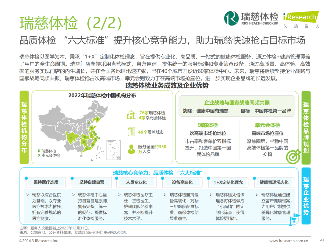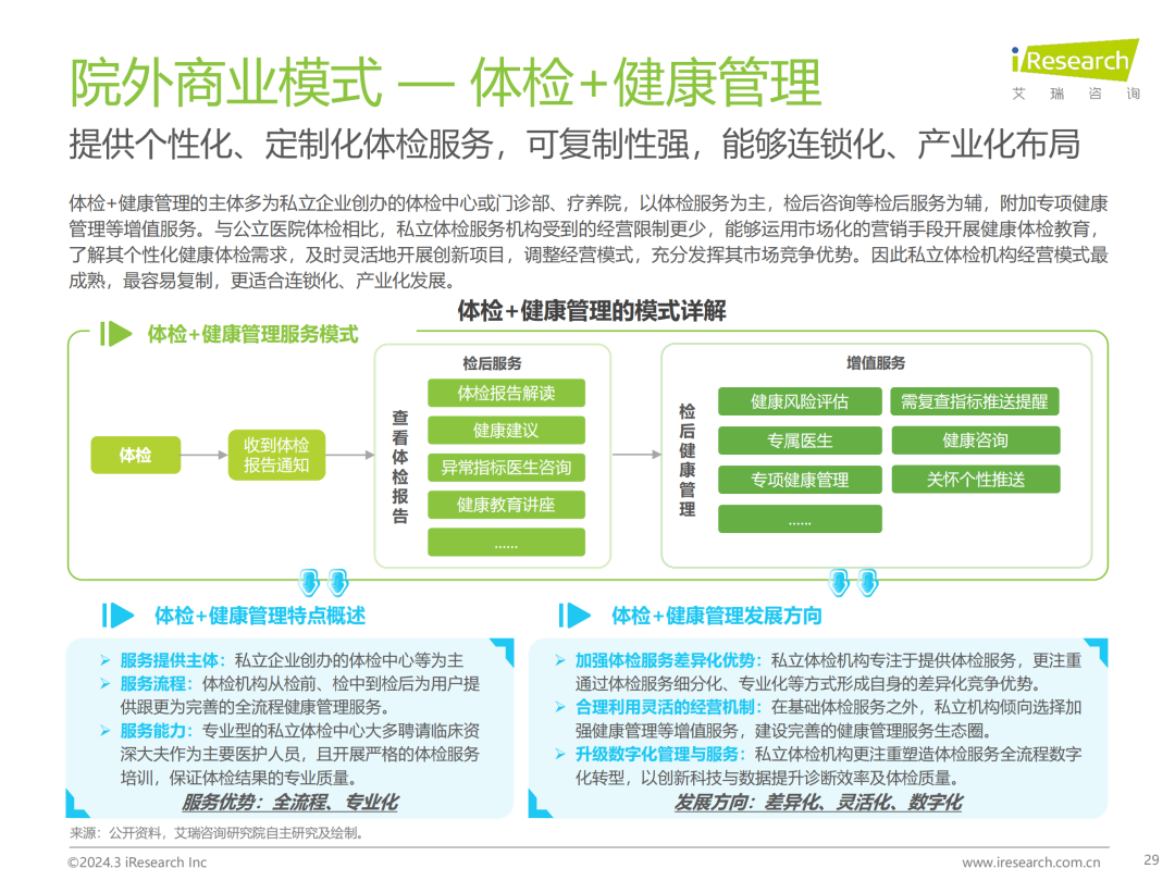 • 院外-体检+健康管理:提供个性化体检服务,适应连锁化、产业化布局;
