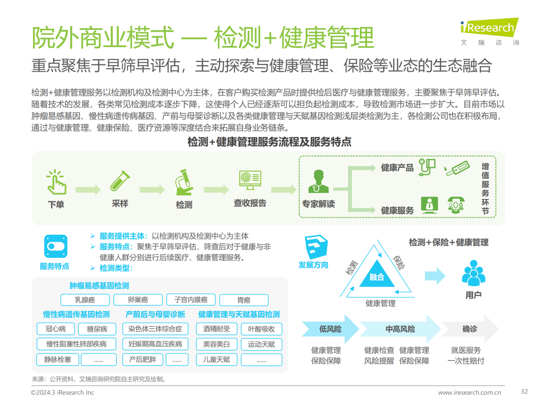 • 院外-检测+健康管理:聚焦于早筛早评估,主动与健康管理、保险等业态融合;