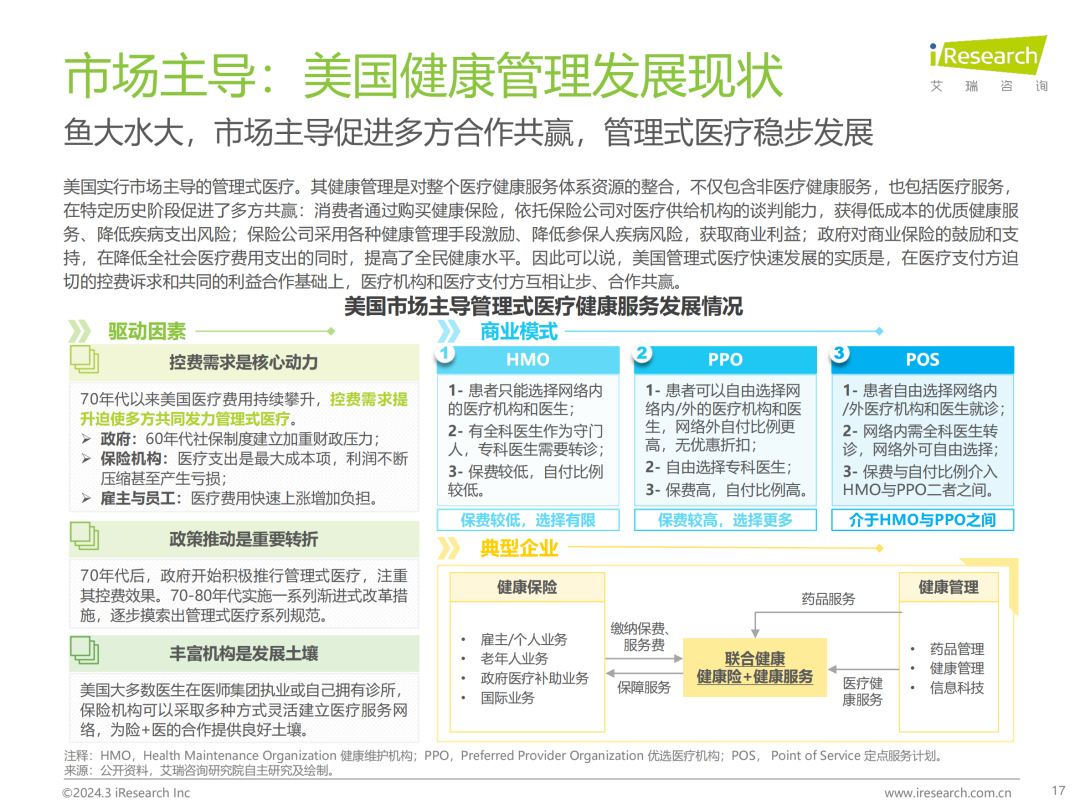 • 市场主导-美国:鱼大水大,市场主导促进多方合作共赢,管理式医疗稳步发展;