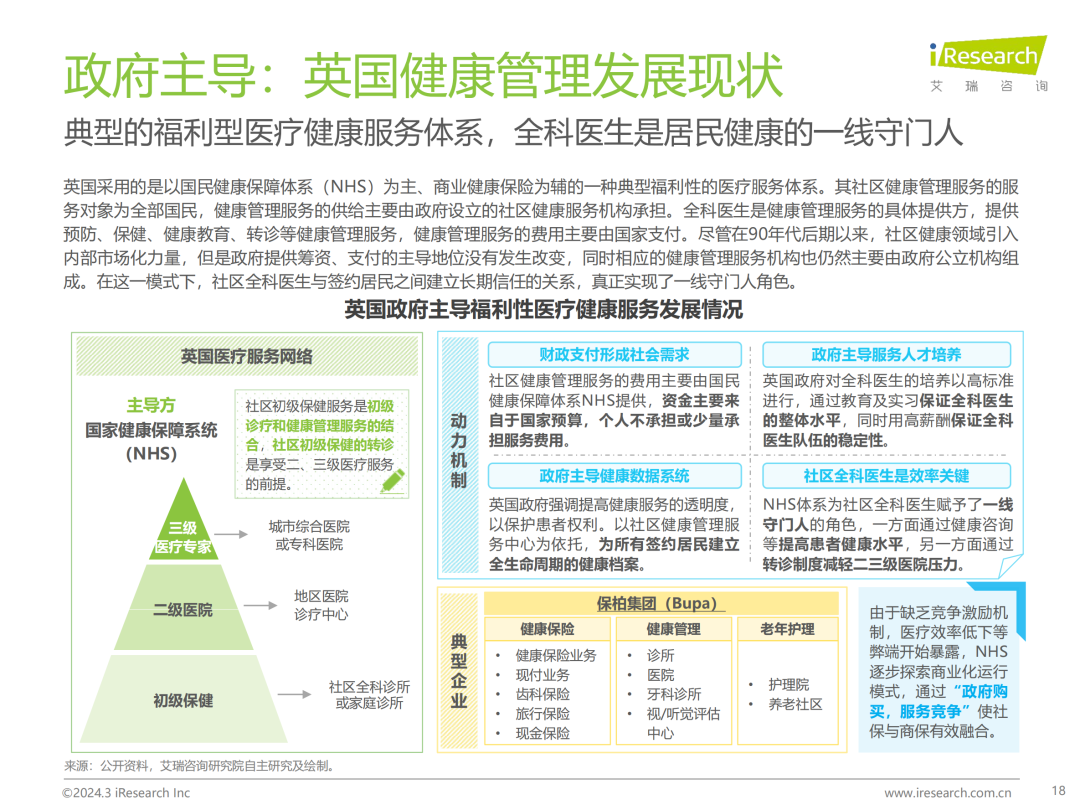 • 政府主导-英国:福利型医疗健康服务体系,全科医生是居民健康的一线守门人;