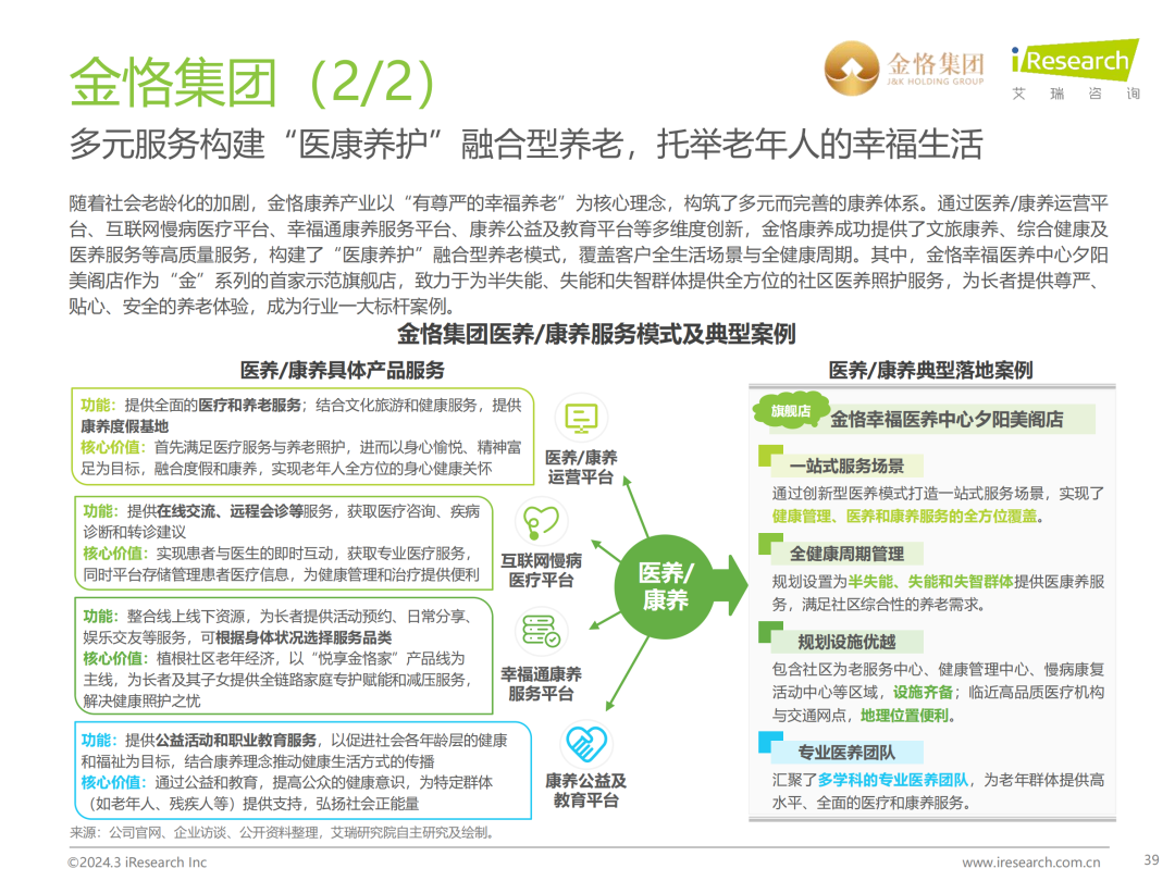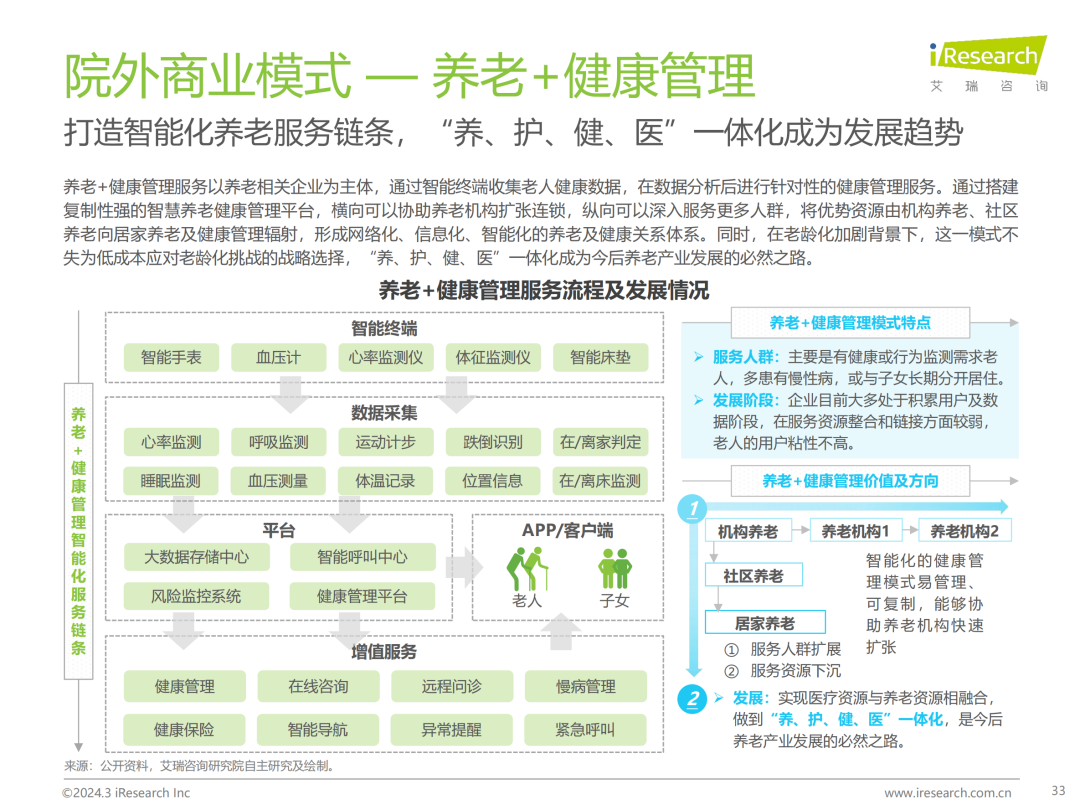 • 院外-养老+健康管理:智能化支撑,“养、护、健、医”一体化成为发展趋势。
