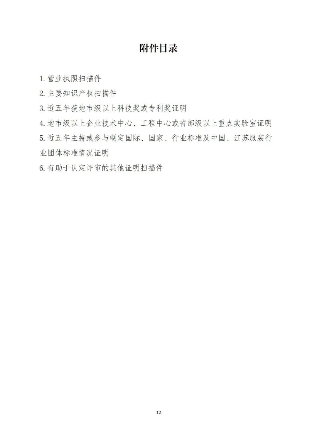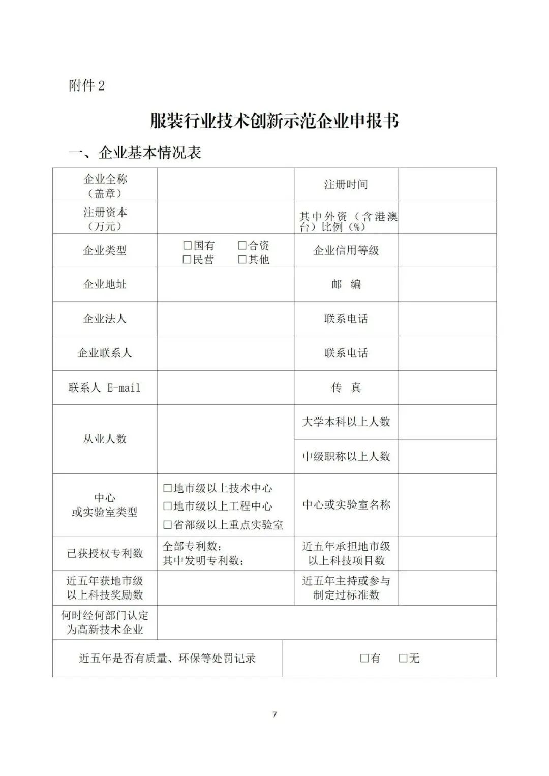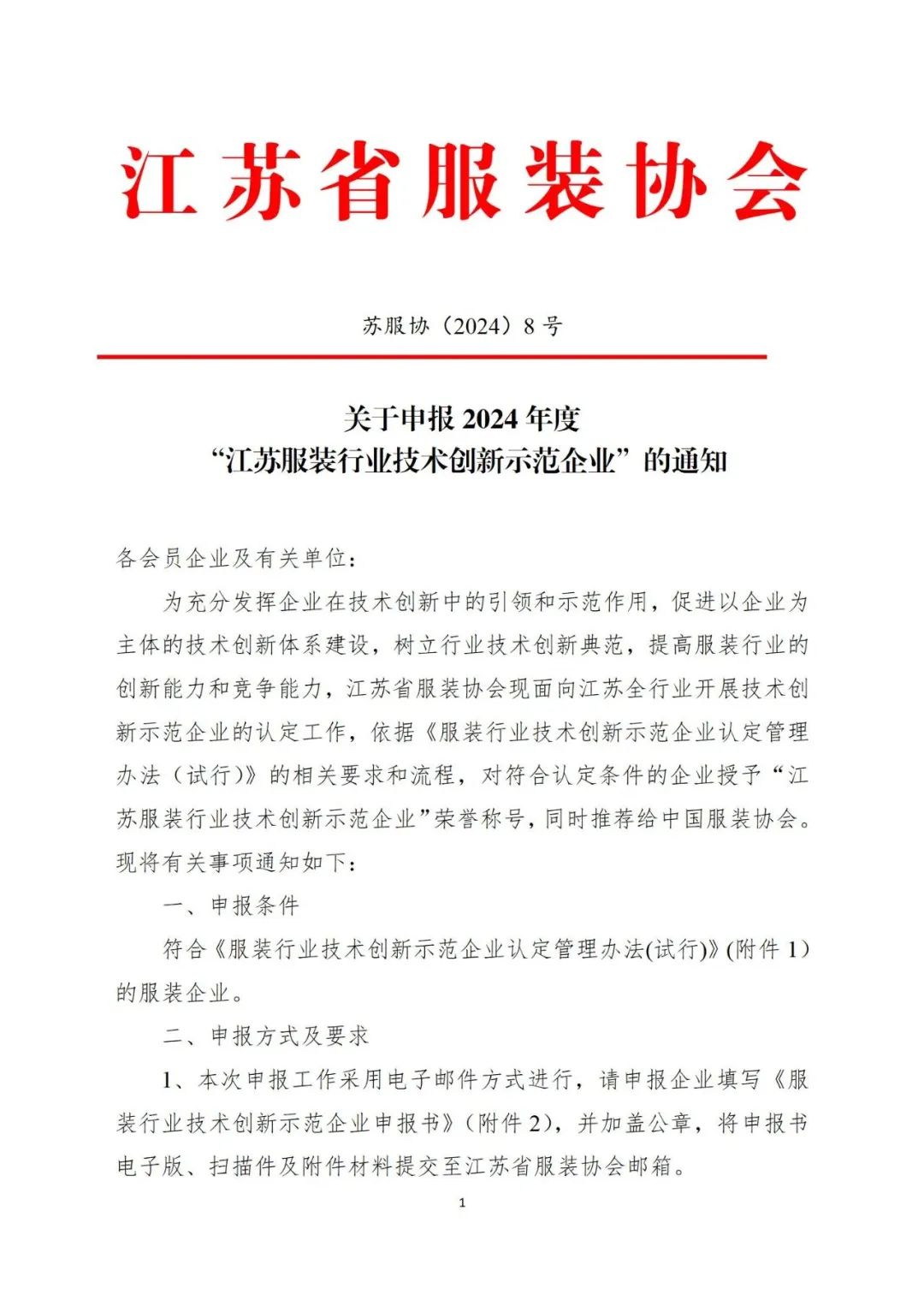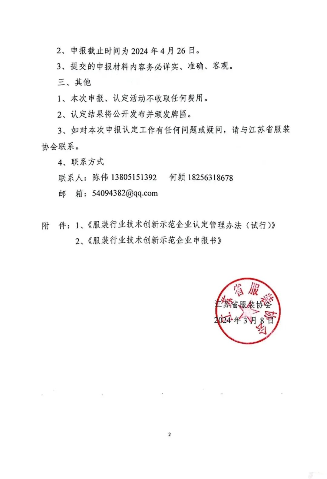 1、本次申报工作采用电子邮件方式进行,请申报企业填写《服装行业技术创新示范企业申报书》(附件2),并加盖公章,将申报书电子版、扫描件及附件材料提交至江苏省服装协会邮箱。