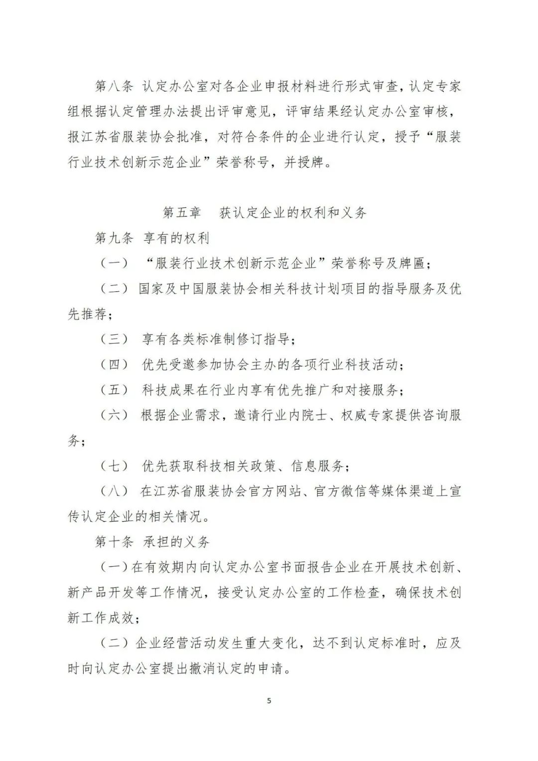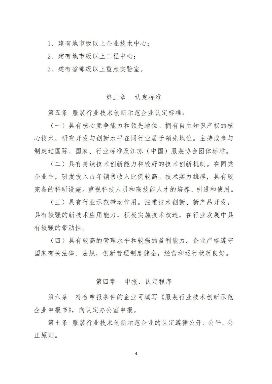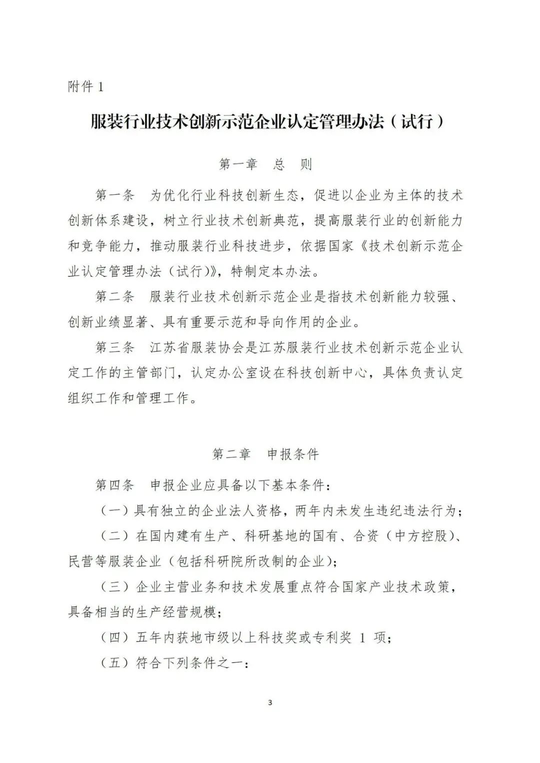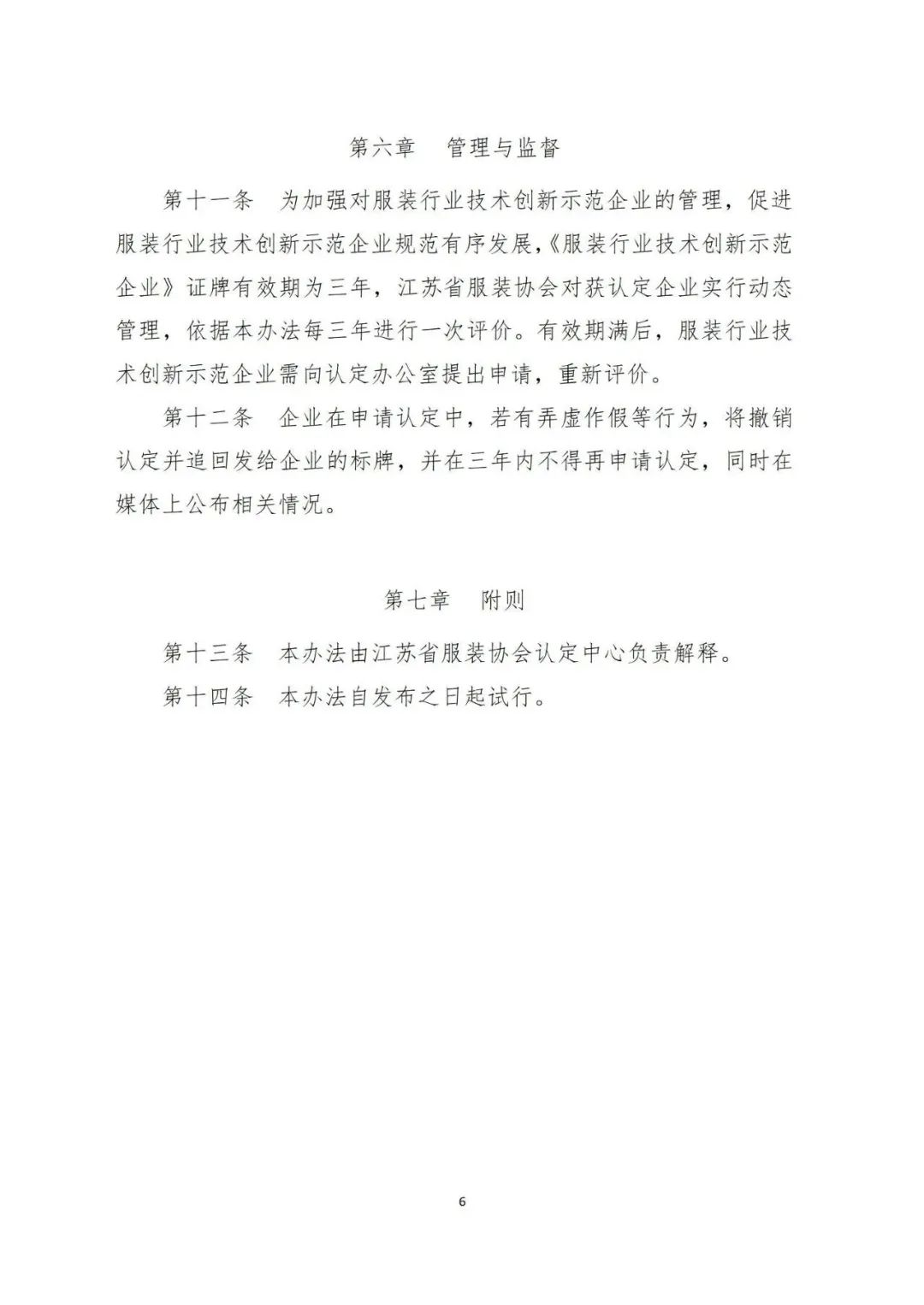 为充分发挥企业在技术创新中的引领和示范作用,促进以企业为主体的技术创新体系建设,树立行业技术创新典范,提高服装行业的创新能力和竞争能力,江苏省服装协会现面向江苏全行业开展技术创新示范企业的认定工作,依据《服装行业技术创新示范企业认定管理办法(试行)》的相关要求和流程,对符合认定条件的企业授予“江苏服装行业技术创新示范企业”荣誉称号,同时推荐给中国服装协会。现将有关事项通知如下: