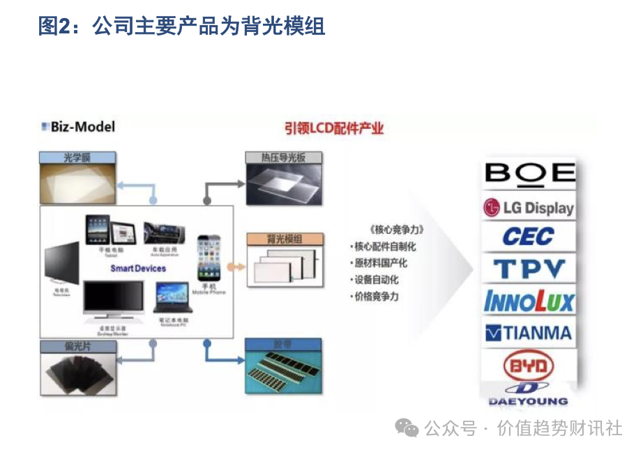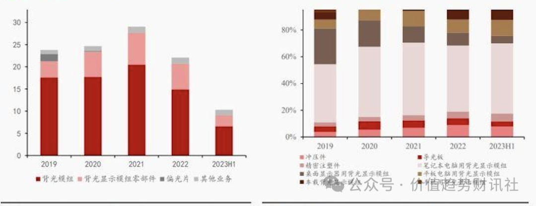 华福证券认为,未来五年内全球PC产业将稳步迈入Al时代。随着硬件终端的逐步成熟和应用场景的不断拓宽,Al PC或将深度变革PC产业,并驱动相关产业链进入新一轮增长。华鑫证券研报称,Al PC是PC行业近十年以来最大的一次技术变革,将为PC行业生态注入新动能,带动新一轮的成长机遇。公司深耕笔记本电脑电背光模组领域,有望受益于 AIPC 行业发展,笔电行业有望迎来拐点,行业景气度有望提升。 【翰博高新】由光学膜业务起家,在2014年后掌握背光模组核心工艺,通过垂直整合以及行业持续深耕,目前背光模组下游涵盖笔记本电脑、平板、车载、桌面显示器等多细分领域,自2019年起背光面模组业务收入占比超60%。同时自2017年起公司产品进行横向拓展延伸,在MiniLED和OLED等新型半导体显示技术领域取得进展的同时也获得市场主流厂商认可。公司的产品背光模组主要应用于笔记本电脑、车载显示等领域,与京东方、华星光电、群创光电、深天马、惠科等知名显示面板制造商建立了合作关系,覆盖华为、联想、惠普、戴尔、华硕及小米等知名消费电子企业。京东方为公司第一大客户,2022年京东方销售额占公司总销售额比例为80.18%。背光显示模组行业具有较高的客户认证壁垒,近年来公司前五大客户销售额占比均在90%以上,其中,第一大客户为液晶面板龙头供应商京东方,2022年京东方销售额占公司总销售额比例为80.18%。 截至2022年底,公司共有显示器背光模组产线4条,合计设计产能600万片;笔记本电脑背光模组产线28条,合计设计产能4915万片;平板电脑背光模组产线12条,合计设计产能约1387万片;车载背光模组产线4条,合计设计产能约368万片。受行业景气度下行及下游消费需求疲软影响,公司产销量出现下滑,2022年营收同比下滑,归母净利润亏损。2023年1-9月尽管行业周期影响延续,但下游出现回暖迹象,公司营收调整幅度收窄,归母净利润受益于出售成都拓维等子公司控制权产生的投资收益,2023年1-9月归母净利润达0.77亿元,同比上升147.9%。公司发布的业绩预告显示,2023年将实现扭亏为盈。从公司营收情况来看,公司主要提供背光模组产品及其零部件,其中背光模组产品2019-2023H1占比均超过60%,占比由2019年的73.9%下降至2023H163.8%,产品结构调整。公司背光模组产品中主要包括笔记本电脑、平板、车载、桌面显示器用背光模组等,自2021年起,手机用背光模组产品不产生营收,公司产品结构进行调整,停止手机端供货,车载领域背光模组占比提升,于2023H1达12.4%。 汽车智能化带动全球车载显示产业创新浪潮,根据GlobalMarketInsights预计,2025年车载显示领域市场规模将达到240亿美元,2020-2025年复合增速达12%。目前在车载显示器领域,背光显示模组主要应用板块包括车载导航、中央控制屏、仪表盘、液晶后视镜以及后座娱乐显示屏幕等。 公司已经具备成熟的车载连屏设计与工艺方式,包括相应的贴合工艺、胶水种类、工序类型等,并实现多样车载连屏,包括二连屏、三连屏、Z型屏等,可整合单一LCM即包含驾驶、中控、副驾三个单元。公司车用Mini-LED背光产品已经与多家Tier1供应商及整车厂商展开合作,Tier1供应商主要包括:海微科技、华安鑫创、航盛电子、马瑞利、延锋伟世通、弗吉亚、华勤电子、亿卡通、歌乐电子、豪恩科技、长信科技、好帮手、三旗通信等。品牌及整车厂主要包括:蔚来、哪吒、一汽、东风,上汽、长安、长城、江淮、吉利、福特等。根据公司公告,截至2023年9月,车载领域已有70余项背光模组产品(包括Mini背光模组和传统背光模组)已处于送样、供货或者定点阶段,相关合同预计总金额超过3亿元。车载MiniLED方面,2023年1-6月公司对某龙头面板厂商实现30件12.3寸MiniLED背光产品销售收入5.4万元。随着汽车智能化带动全球车载显示产业创新浪潮,公司的车载Mini LED背光产品必将受益行业发展。 公司作为国内深耕笔电背光模组领域的龙头,产品齐全,获得了京东方、群创光电等知名客户认证,随着AlPC的推出带动笔记本电脑销量反弹,公司有望受益于Al PC行业发展,以及车载显示拉动公司成长。东兴证券预计2023-2025年公司EPS分别为0.31元,0.75元和1.33元。