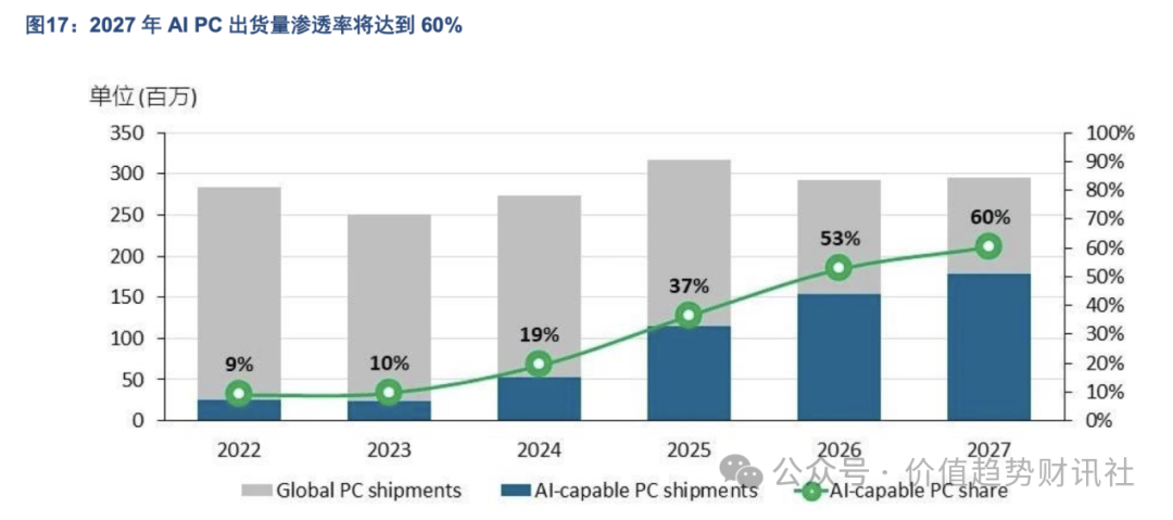 据媒体报道,微软将于3月21日发布SurfacePro10和SurfaceLaptop6,这有望成为微软首批Al PC产品。根据英特尔发布的“AI PC 加速计划”,预计 2025 年前将会推出超过 1 亿台 AI PC,我们认为客户端 AI 产业应用有望加速。AI PC能够针对工作、学习、 生活等场景,为用户提供通用场景下的个性化服务。AI PC 的到来标志着 PC产业的重大转折,Canalys预计商务市场于2025年-2030年迎来AI PC浪潮。 预计2024 H1将出现新一轮的AIPC浪潮,2027年AIPC出货量渗透率将达到60%。