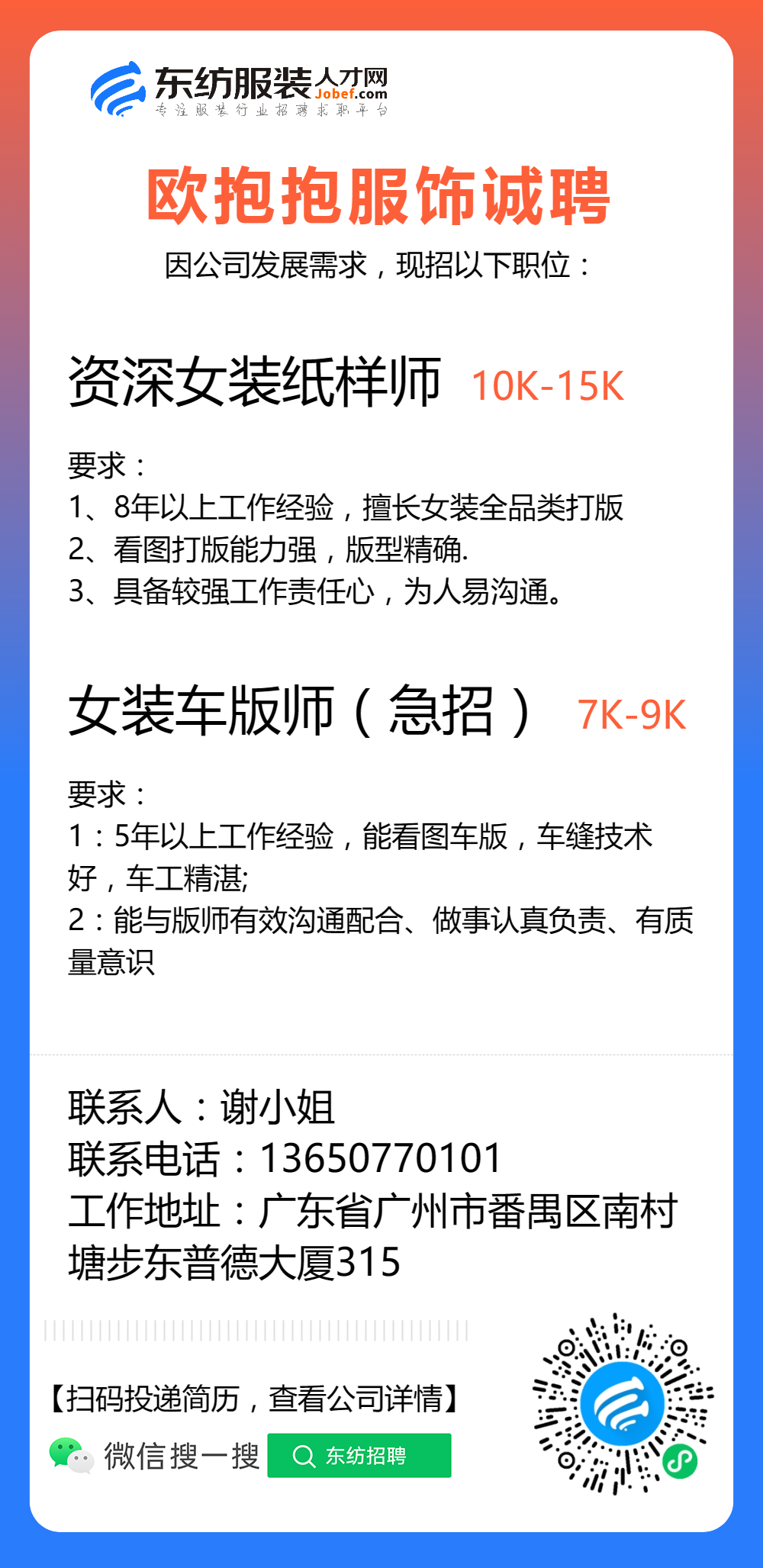 服装招聘·技术类丨3. 17号,打版师、车版师……