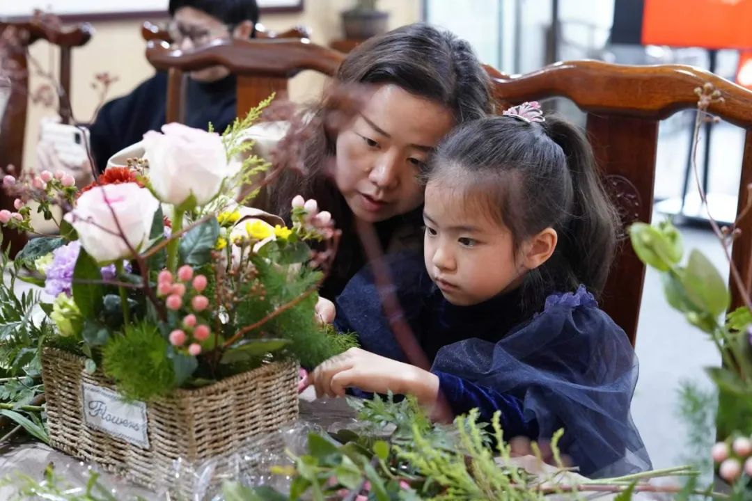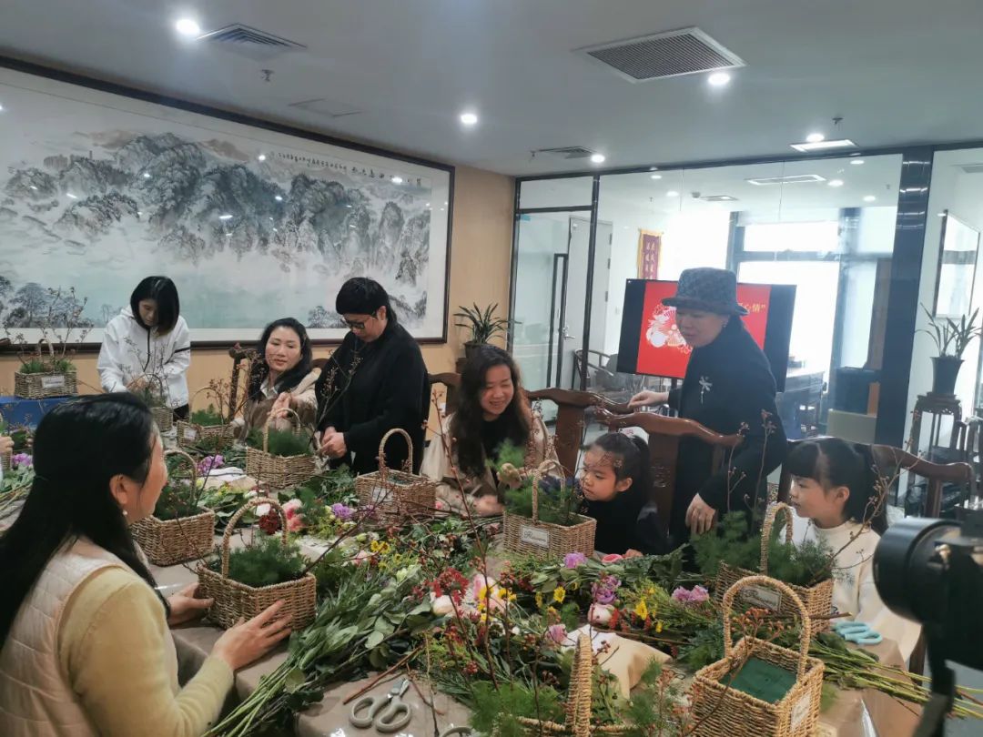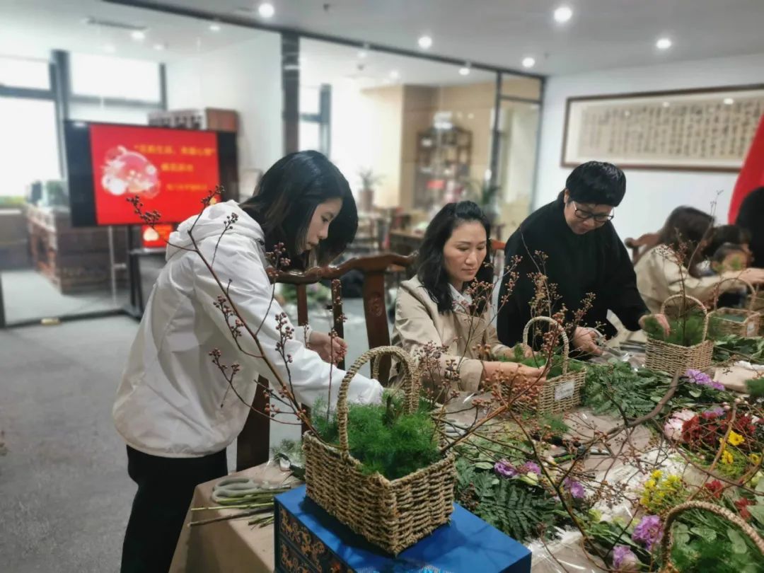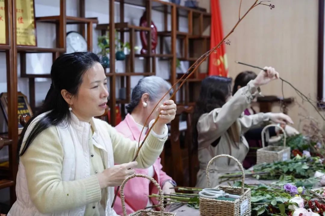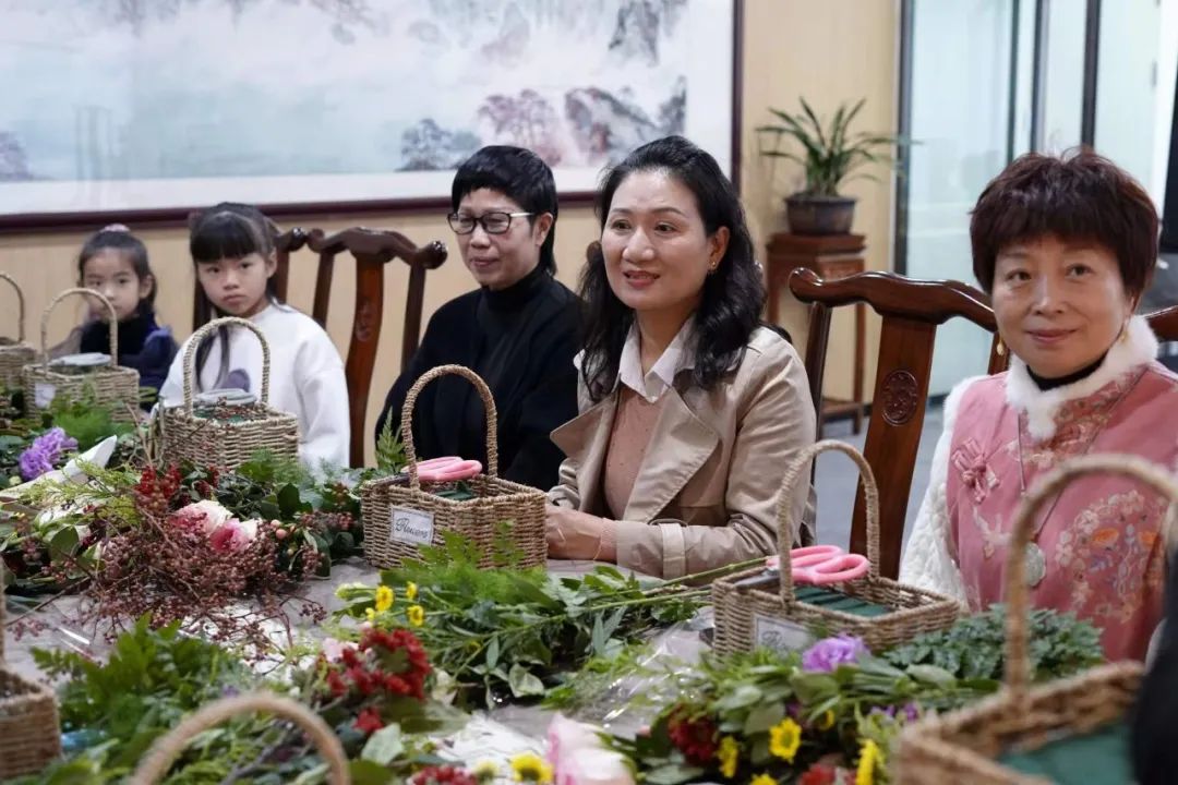 师的指导下,大家开始尝试将一朵朵鲜花插入花篮中,通过巧妙的搭配和布局,展现出独特的艺术美感。
