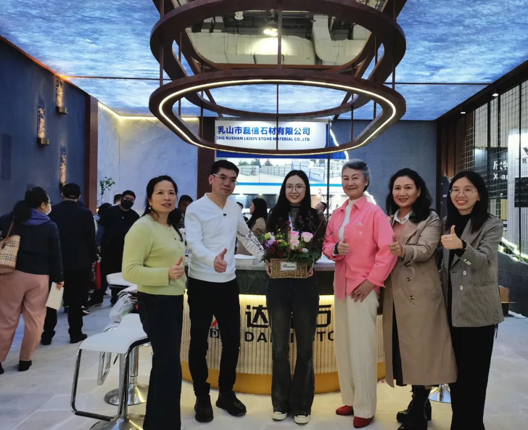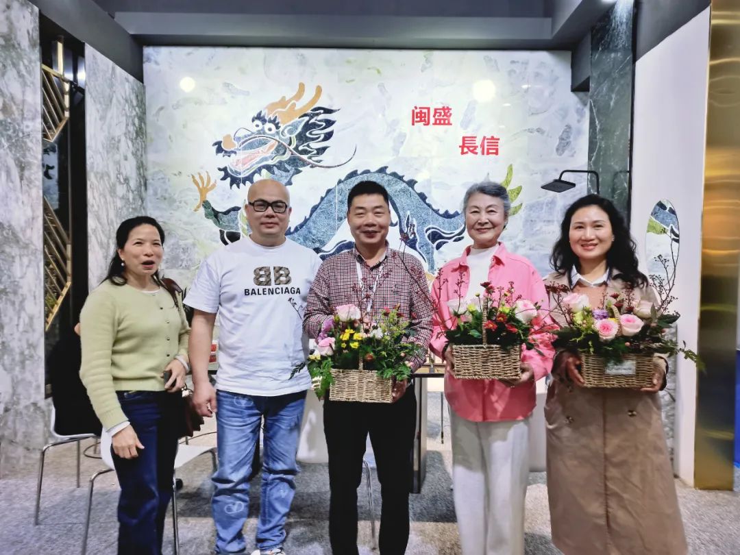插花活动结束后,大家提着美丽的花篮一同前往厦门国际石材展,参观我会会员企业的石材展厅,并送上亲手制作的花篮。