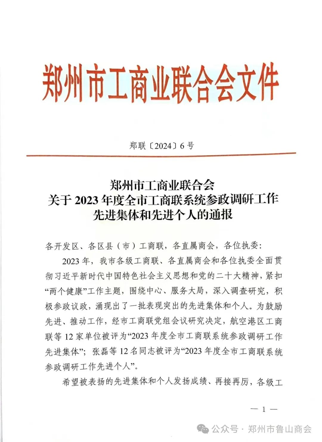 郑州市鲁山商会秘书长吴延召参加了本次会议。在本次大会上,郑州市鲁山商会荣获“2023年度全市工商联系统参政调研工作先进集体”。