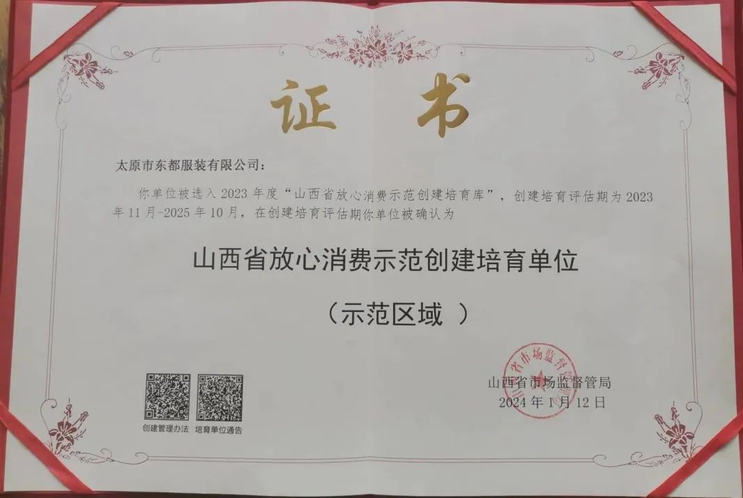 在太原市市委市政府举办的“3·15”消费者权益日的主题大会上,太原市東都服装有限公司党支部书记尹毅,荣获代表展现服装城集团创业新风貌的“山西省放心消费示范创建培育单位(示范区域)”的奖励证书,激发了市场主体营造“放心消费”环境的热情。