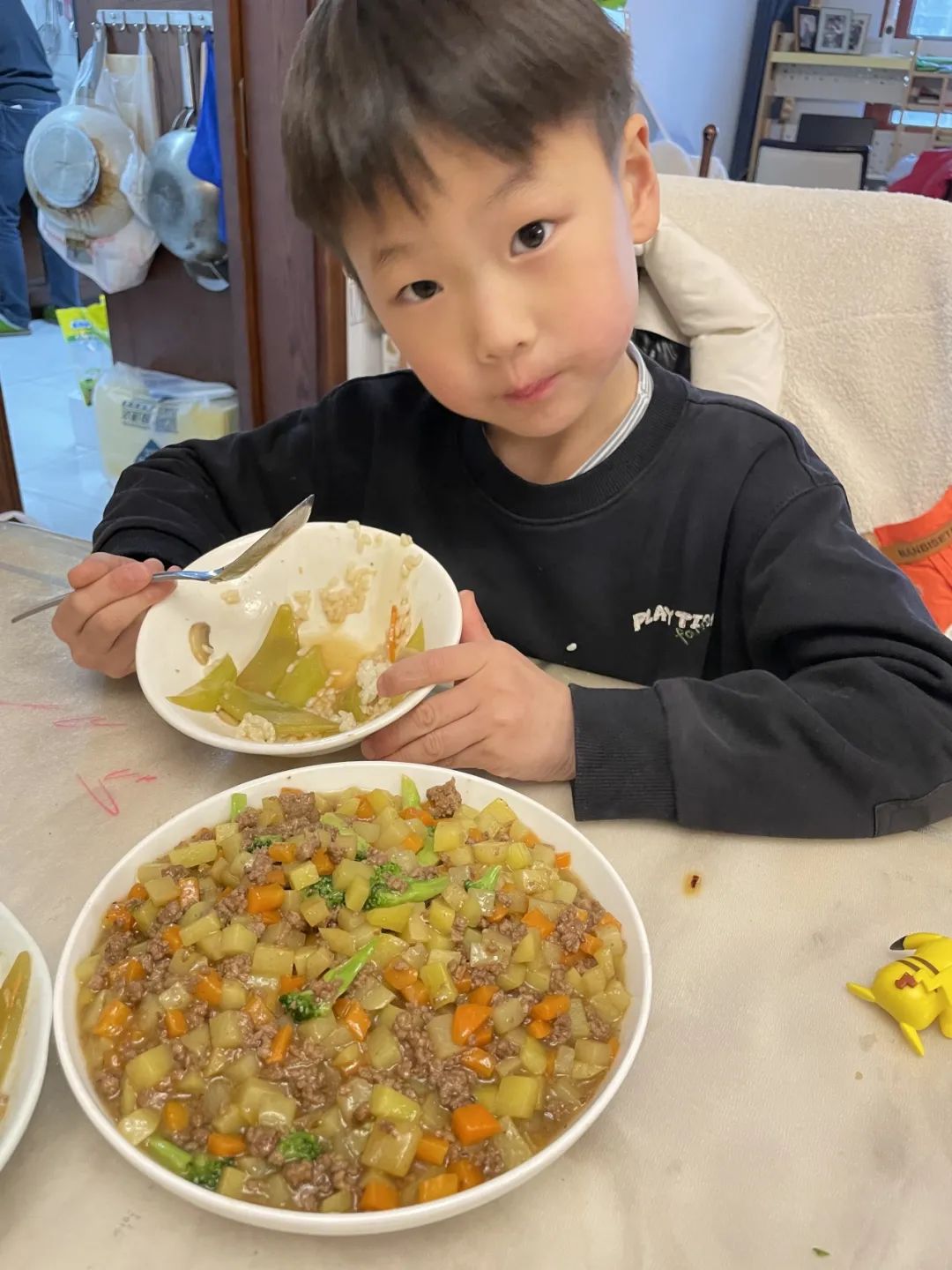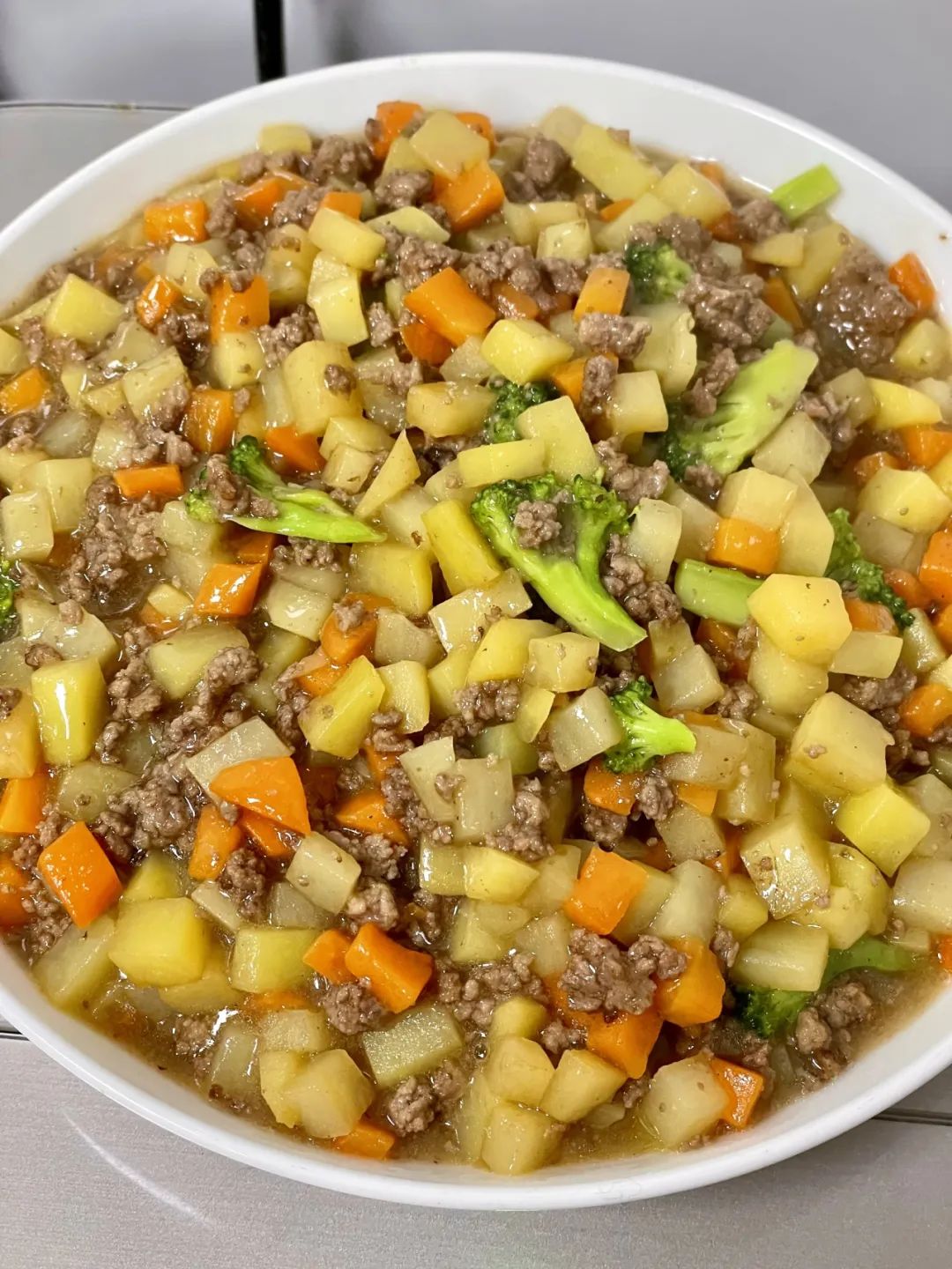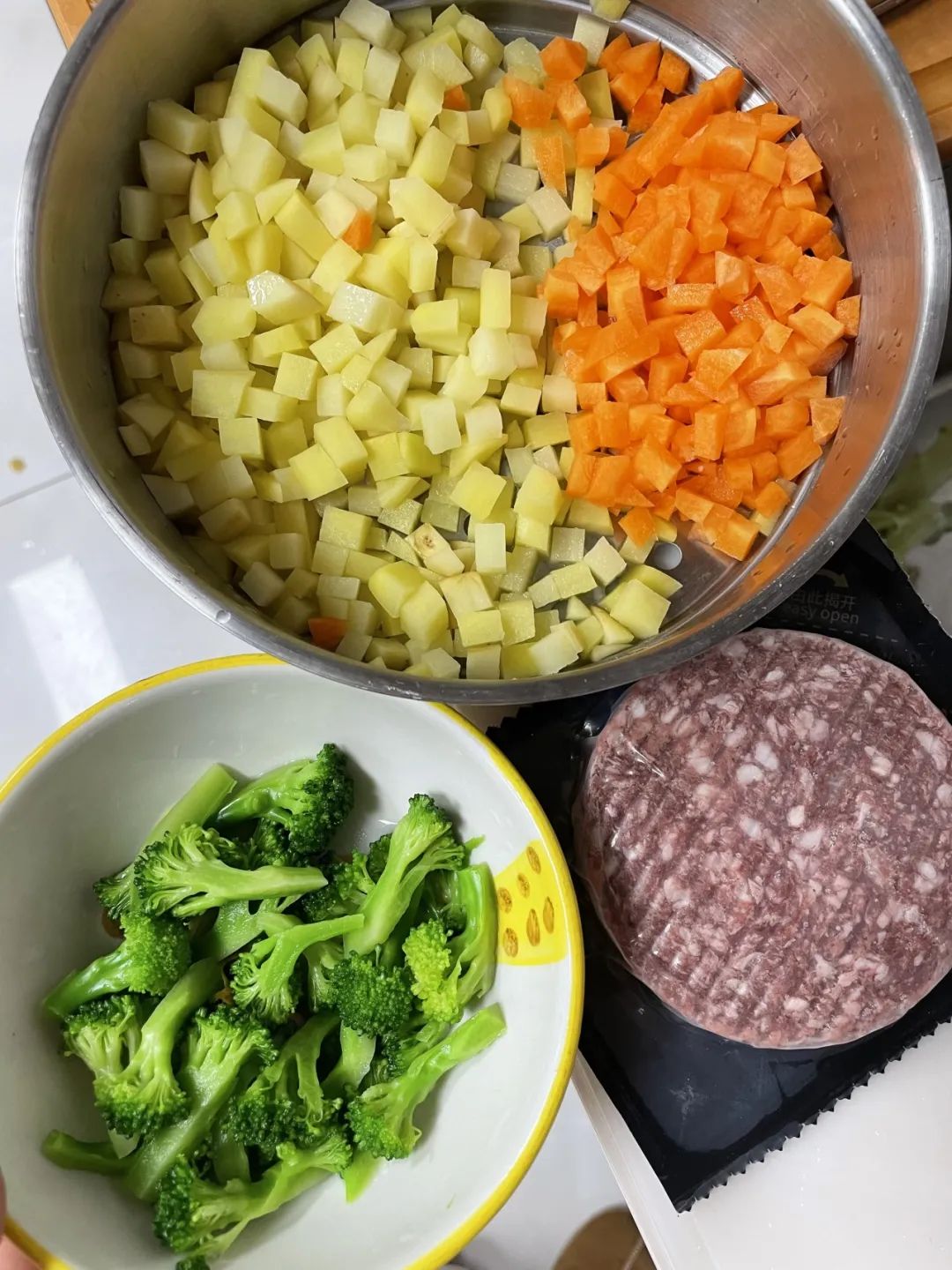 1. 主材:土豆,西兰花(开水烫至半熟),胡萝卜,牛肉末;