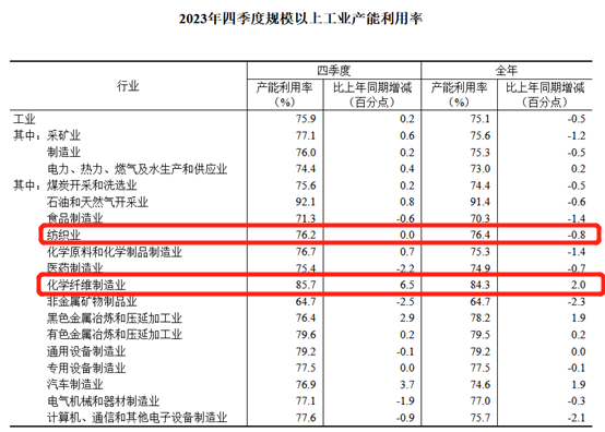 2023年纺织行业产能利用率和生产形势稳中有升。根据国家统计局数据,2023年纺织业和化纤业产能利用率分别为76.4%和84.3%,均高于同期全国工业产能利用水平,其中化纤业产能利用率较上年提高2个百分点。