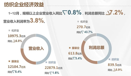 产业链绝大多数环节效益情况较上年明显改善,化纤、毛纺织、丝绸、长丝织造、印染等行业营业收入同比实现正增长;化纤、丝绸、棉纺织、毛纺织、麻纺织和纺织机械等行业利润总额同比增幅超过10%。