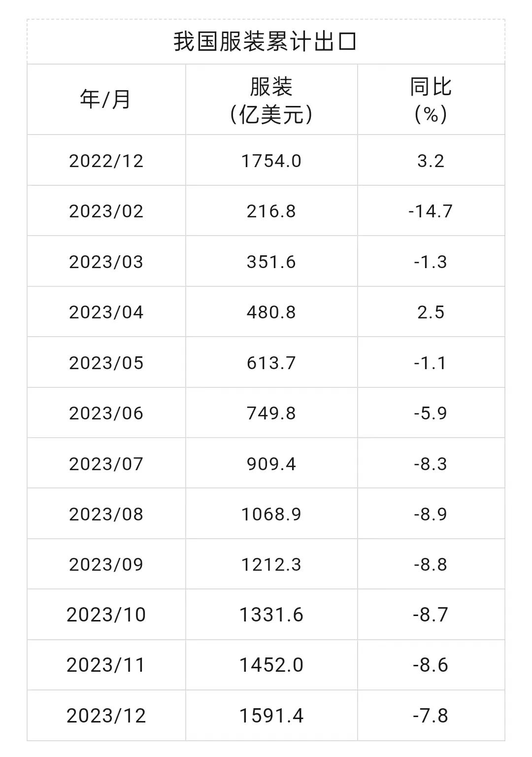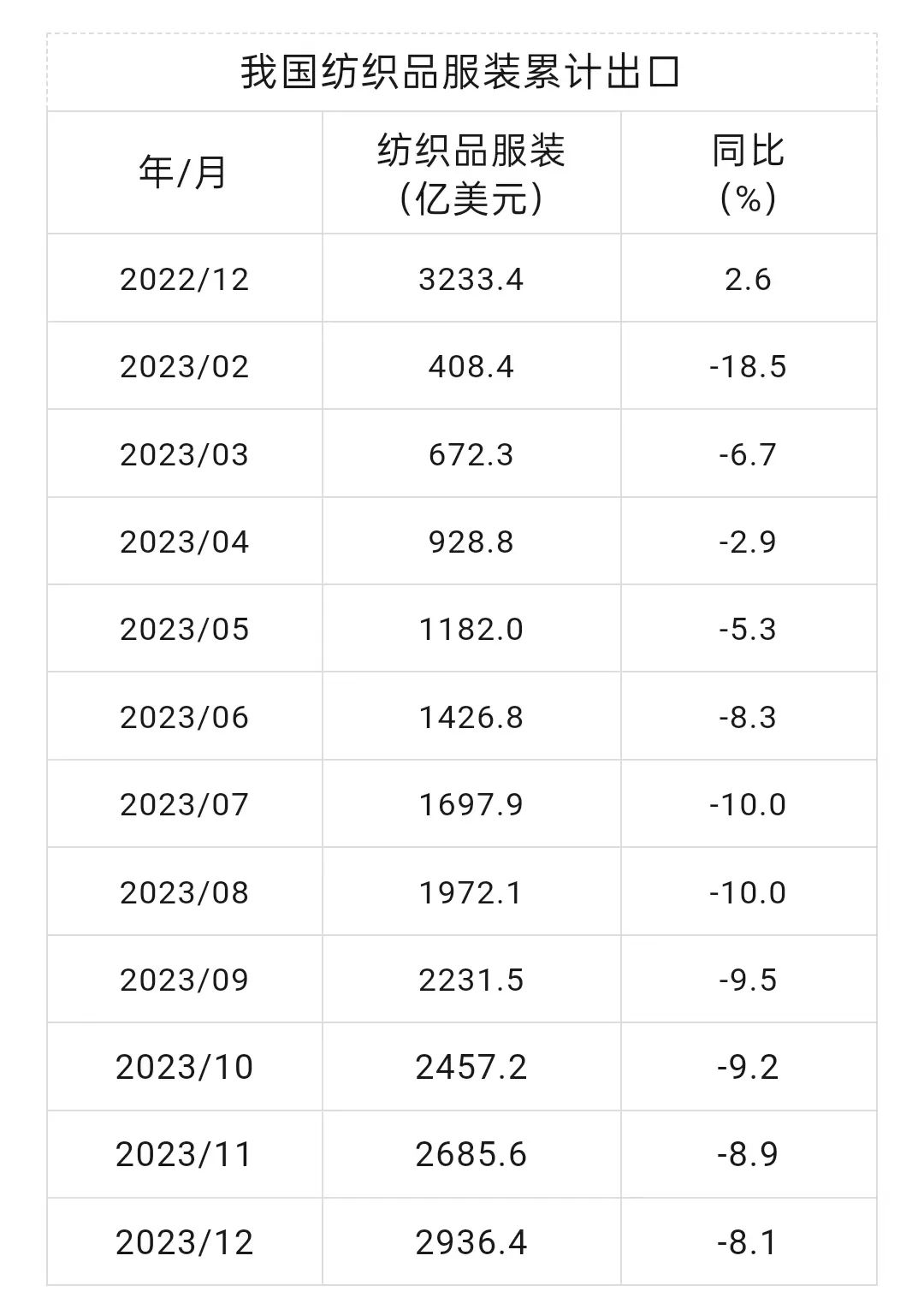 根据中国海关快报数据,2023年我国纺织品服装出口总额为2936.4亿美元(不含海关HS编码94章中的纺织品),同比减少8.1%,增速较2022年回落10.6个百分点,但累计降幅自9月以来逐步收窄,其中12月当月出口253亿美元,同比增长2.6%,重新恢复单月正增长。