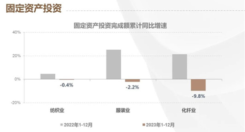 2023年,我国纺织业、服装业和化纤业固定资产投资完成额同比分别减少0.4%、2.2%和9.8%,增速虽然均较2022年有所回落,但较2023年内低位水平分别收窄10.6、3.5和1.8个百分点。