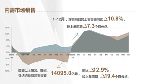 2023年,我国纺织服装内需保持较好回暖势头。国家统计局数据显示,2023年全国限额以上单位消费品零售总额178563亿元,同比增长6.5%,其中,服装、鞋帽、针纺织品类商品零售额同比增长12.9%,增速较2022年大幅回升19.4个百分点,整体零售规模超过疫情前水平。