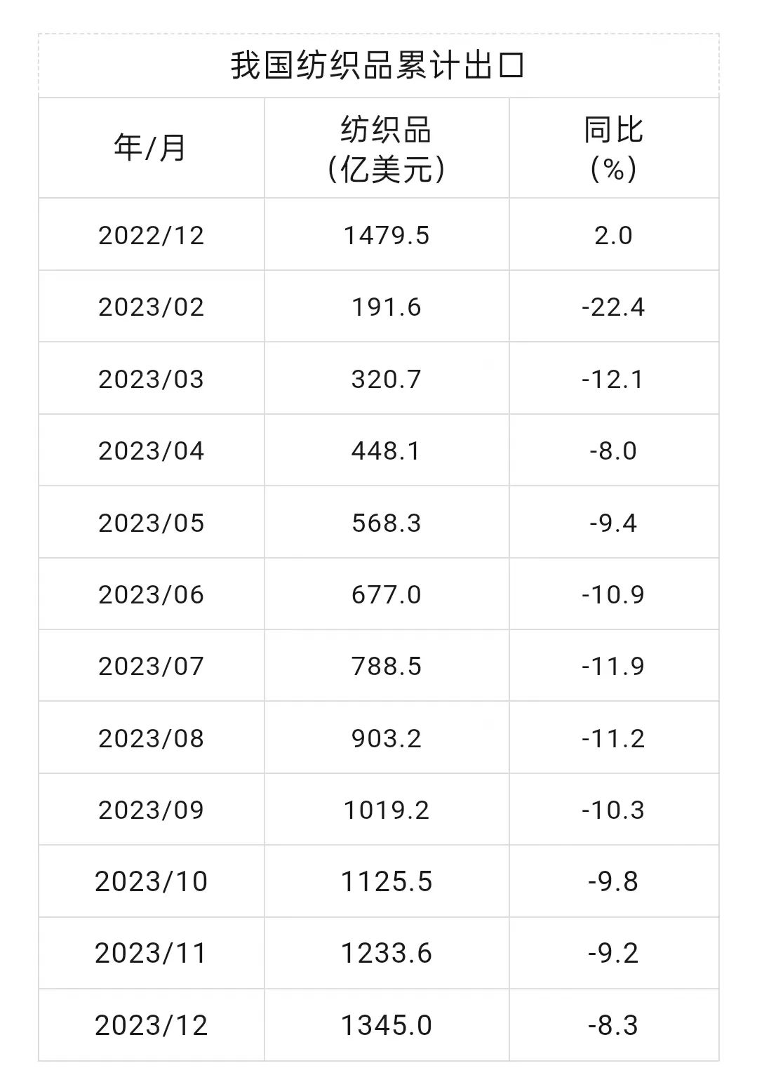 主要出口产品中,纺织品(纺织纱线、织物及制成品)出口额为1345亿美元,同比减少8.3%;服装出口额为1591.4亿美元,同比减少7.8%。