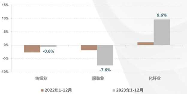 2023年,纺织行业规模以上企业工业增加值同比减少1.2%,降幅较2022年收窄0.7个百分点。其中,纺织业工业增加值降幅收窄至-0.6%,较2022年提高2.1个百分点;化纤业工业增加值增速于一季度由负转正后持续加快,全年同比增长9.6%,较上年回升8.5个百分点。