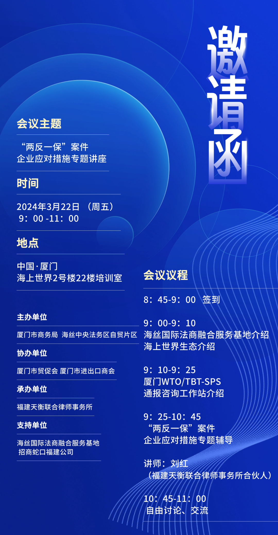 为帮助企业进一步掌握贸易救济调查规则,强化企业应对国际贸易摩擦能力,助力企业提升国际化经营风险处置能力,厦门市商务局、海丝中央法务区自贸片区定于2024年3月22日举办“两反一保”案件企业应对措施专题讲座。