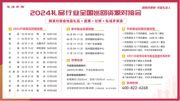 本场展会是2024年全国礼品行业的第一场展会,之后笔海弄潮还将在厦门、昆明、上海、长沙、南宁、贵阳、天津、石家庄、太原、北京等23个城市举办礼品行业全国巡回展,更有杭州、郑州、广州的豪华版巡回展。
