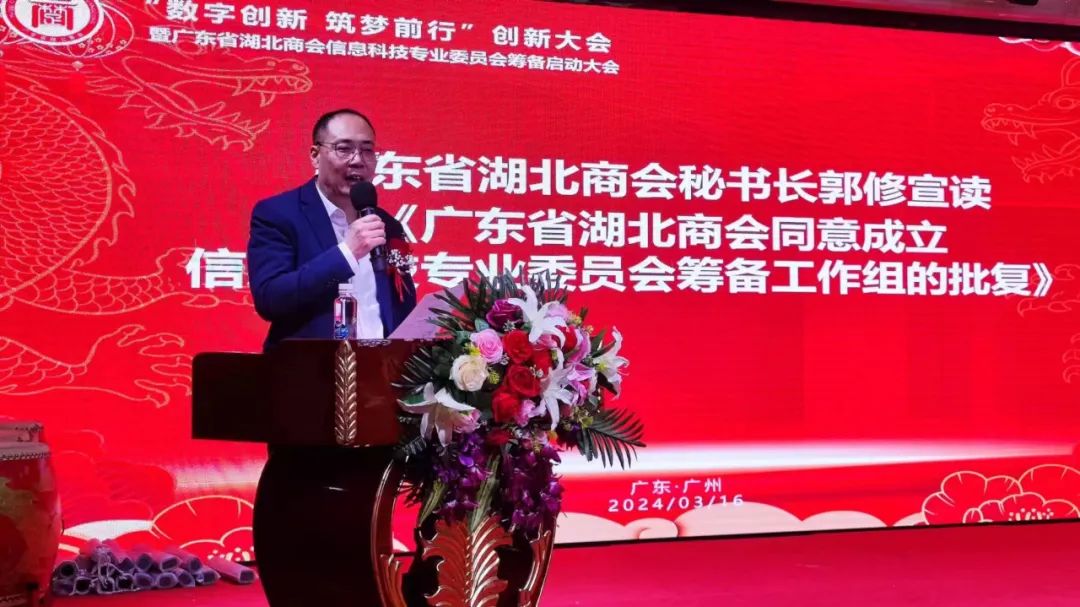 随后,广东省湖北商会秘书长郭修宣读了《广东省湖北商会同意成立信息科技专业委员会筹备工作组的批复》文件,为信息科技专业委员会的成立奠定了坚实的基础。