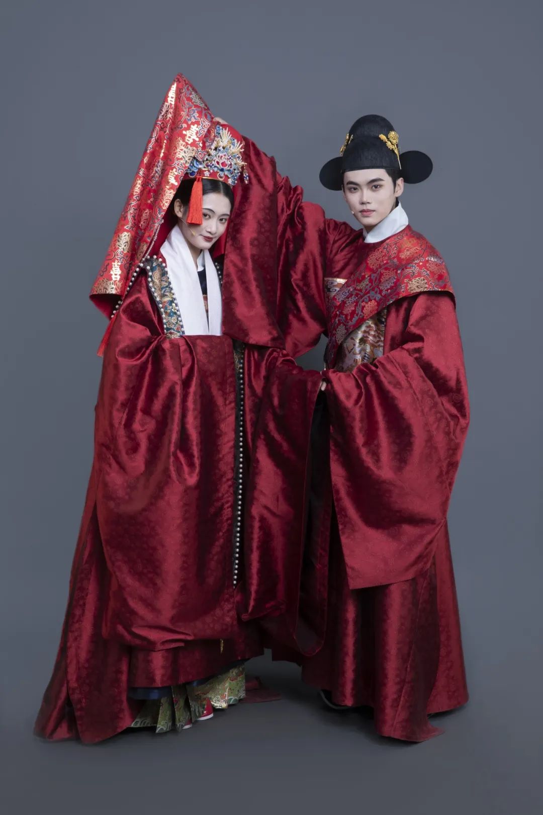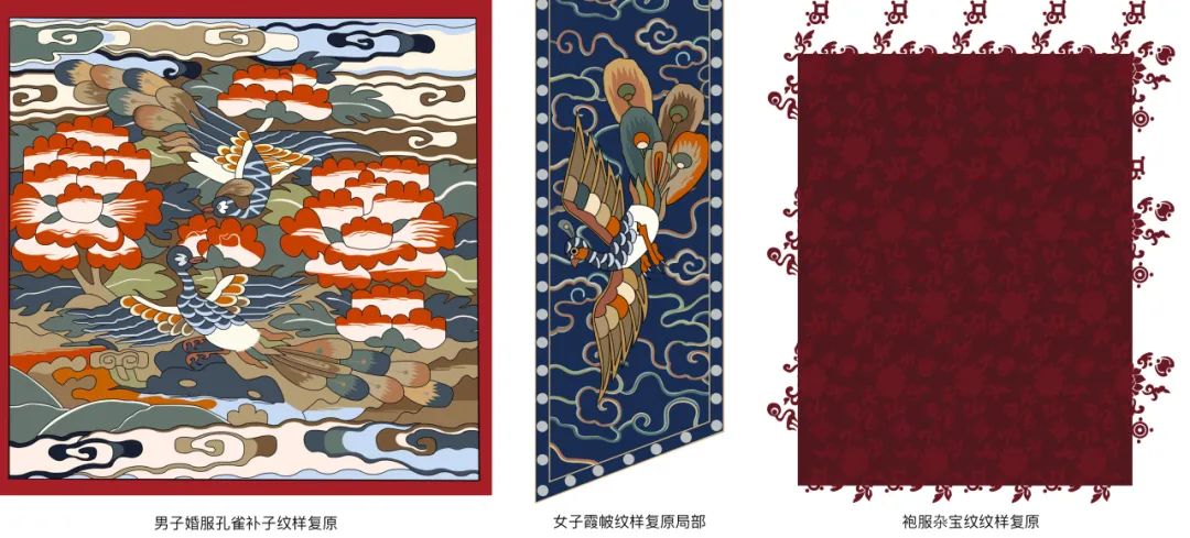 明代是中国传统婚服发展的高峰时期,在唐宋婚服形制的基础上,形成沉稳端庄的服饰风格,为此后数百年女性大红吉服、上衣下裳、凤冠霞帔等传统婚服形制奠定基础。研究团队根据《明会典》《续通典》《明史·志·卷四十三》等古籍资料,以及江西高安胡镇墓出土文物、北京艺术博物馆馆藏品、明宁靖王夫人吴氏墓出土文物、孔府旧藏明代藏品、京定陵出土文物等,根据明代普遍存在的“僭越”现象,如行亲迎之礼时的——“庶人婚嫁,但得假用九品服。妇服花钗大袖,所谓凤冠霞帔”,设定复原婚服为三品文官。新郎婚服为圆领袍、贴里、簪花乌纱帽、革带、披红、皂靴;新娘婚服为大袖衫、霞帔、鞠衣、直裰、马面裙、五翟冠、红盖头、绣花鞋,圆领袍和鞠衣胸背补子选用三品文官所对应的孔雀补。