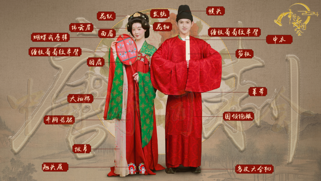 唐代文化开放、经济繁荣,服装样式更加丰富艳丽。研究团队发现,虽《大唐开元礼》中有关于婚服的信息,如“花钗、大袖连裳,青质,素纱中单,蔽膝,大带,以青革带,韈履……六品已下九品已上妻及九品已上女嫁则服之……”等文字记录,但在盛唐敦煌壁画《婚嫁图》中也出现新娘襦裙制、新郎圆领袍服制形式,可见民间流行的样式也会出现于婚礼中。在信息繁杂甚至图文矛盾的情况下,研究团队查阅《唐六典》《旧唐书》《大唐开元礼》等古籍,并参考敦煌盛唐时期中原地区和敦煌地区婚礼主题壁画,以及新疆阿斯塔那出土文物、日本正仓院馆藏品、中国丝绸博物馆馆藏文物等图像资料,结合当时社会背景,设定复原人物身份为盛唐时期庶民阶层。色取“红男青女”,新娘“花钗礼衣”装扮为上襦、下裙、外着半臂搭配帔子,头上戴花钗、角梳;男子婚服为圆领襕袍,内着半臂、头戴幞头、脚踩乌皮六合靴,发饰使用较为华丽的花钗、发梳,并饰以琉璃制钿钗进行装饰。