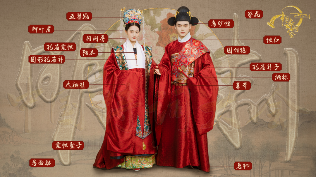 宋代婚礼服饰制度既传承了汉唐的传统,也呈现出新的发展。研究团队根据《宋史·舆服志》《梦梁录》和朱熹《家礼》等古籍中对婚礼仪式穿着规范的描写,并参考福建福州南宋黄昇墓、南京高淳花山墓、宋赵伯澐墓等出土文物,设定复原婚服为宋五品穿着,男子服绯色,女子从之。男子婚礼服为圆领袍、长脚幞头、革带、交领纱袍、裤、报腹;女子婚礼服为大袖衫、褙子、上襦、抹胸、百褶裙、宋裤,并佩戴凤簪花团冠,以三白妆和珍珠妆饰面。