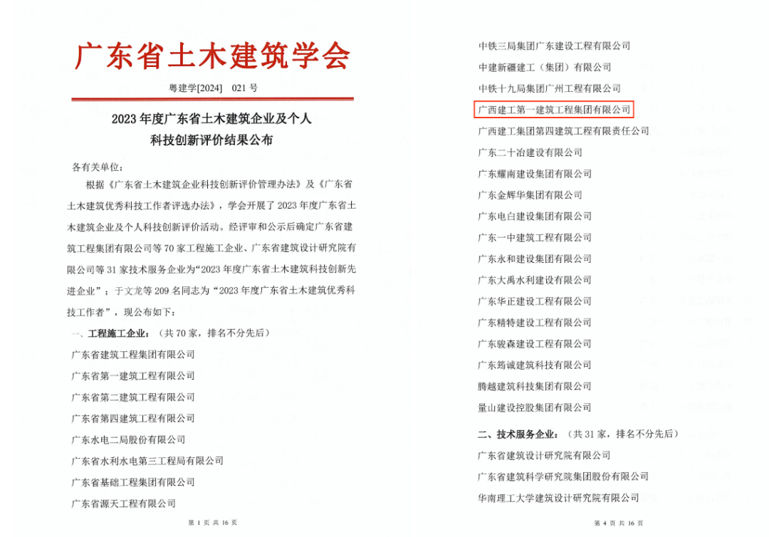 在近日开展的广东省土木建筑企业科技创新评选活动中,广西建工第一建筑工程集团有限公司获评“2023年度广东省土木建筑科技创新先进企业”。本次评选活动共有70家工程施工企业获此殊荣,广西建工一建集团首次参评并成为获奖名单中仅有的两家广西企业之一。建筑时报、中国产业经济信息网对此进行关注报道。