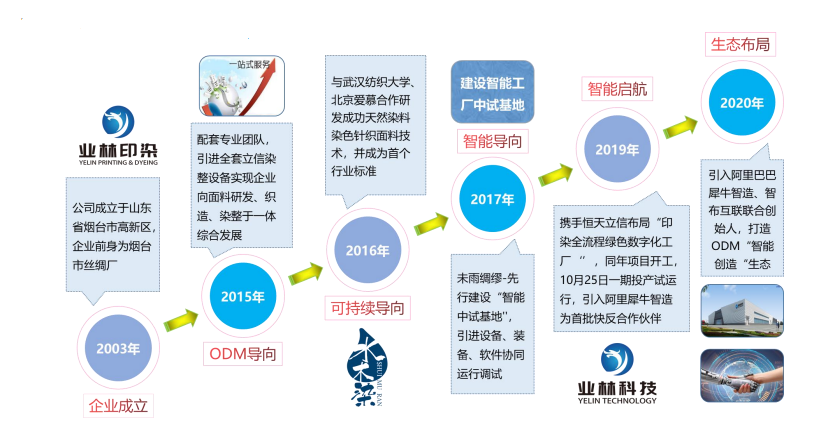 2017年,企业承接工信部制造业2025标杆示范企业项目,与恒天立信合资建设示范性智慧工厂——“烟台纺织科技有限公司”,全部生产过程采用ERP-中控-MES系统管理模式。 基于智慧工厂基础设施,构建了“大数据需求预测-面料智能研发-工艺数字化-物料智能供给-网络化产能协同-云工厂智慧生产-销售数据监测”的业务闭环及数据闭环。以数字化面料为流转载体,以工业大数据湖及工业云计算为核心资源及能力,实现以需求为导向的面料规模化按需柔性生产的创新模式,有效破解非标面料生产无法响应“以销定产、小单快反”的行业痛点。 以数据驱动作为产品开发创新的核心,联合阿里巴巴等消费平台以及品牌对消费者行为数据进行分析,用数据指导产品研发,以数字创新中心为创新中枢,基于面料的颜色数字化、物性数字化、手感数字化的综合解决方案,行业首创通过 AI 智能算法实现精准面料开发。
