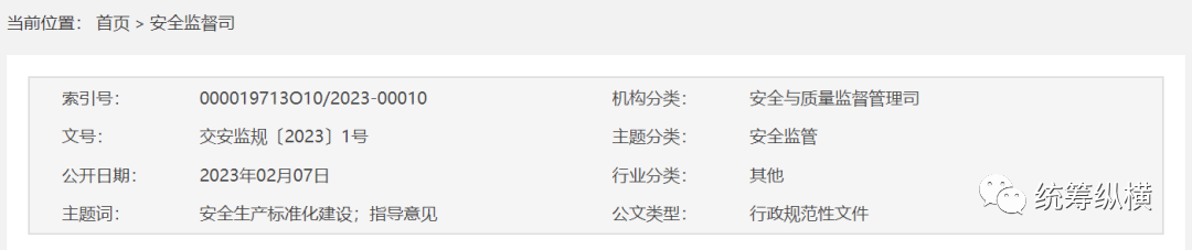 《交通运输部关于加强交通运输安全生产标准化建设的指导意见》(交安监规【2023】1号)文件提出: