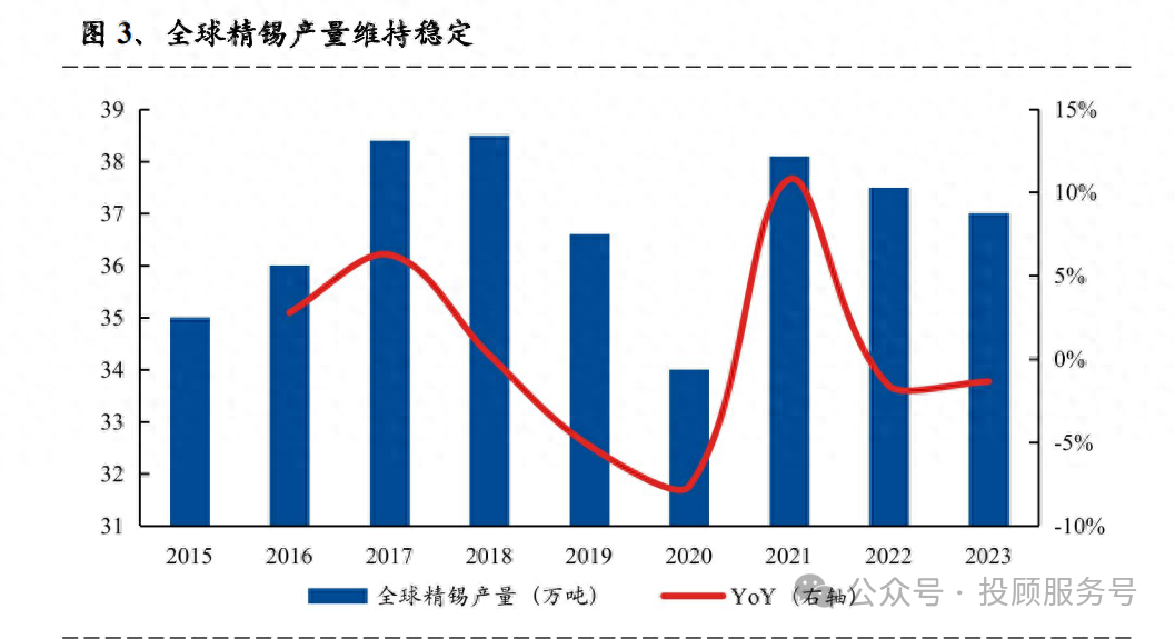 供应瓶颈明显,锡价中枢长期上移。在半导体需求稳步扩张的情况下,全球精锡供给保持稳定。国际锡业协会的数据显示,2015-2023 年全球精锡产量基本维持在35-40 万吨的水平。锡供需逐步抽紧使得锡价中枢长期上移。