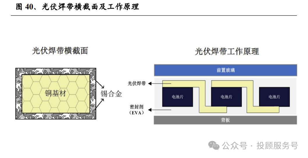 光伏焊带又称涂锡焊带,是光伏组件的重要组成部分,应用于光伏电池片的串联或并联,发挥导电聚电的重要作用,以提升光伏组件的输出电压和功率,占组件成本的 3%左右。焊带材料主要分为含铅焊带(原材料为铜、锡铅合金)和不含铅焊带(原材料为铜、锡银合金或锡铋银合金)两种,其中含铅焊带具有成本低、焊接可靠性高、导电性好等优势,仍为当前主要使用的互联方式,2022 年其市场占比超过 95%。
